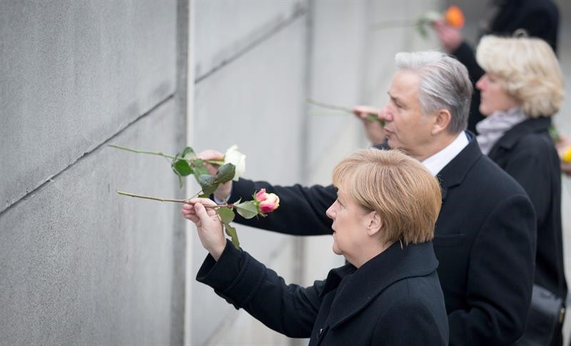 Merkel, acompañada de otras autoridades alemanas dejan flores en las grietas de uno de los vestigios del Muro