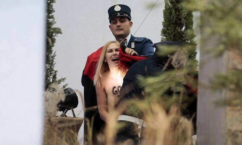 La mujer, con los pechos descubiertos y la frase God is woman (Dios es mujer) escrita en el cuerpo, irrumpió en la plaza de San Pedro cuando Francisco I leía su mensaje de Navidad desde el balcón de la Logia central de la basílica. Mientras profería gritos contra la Iglesia católica, consiguió subir a la representación del portal de Belén monumental colocada en la plaza y asir la figura del niño Jesús, pero cuando escapaba fue detenida por un gendarme.