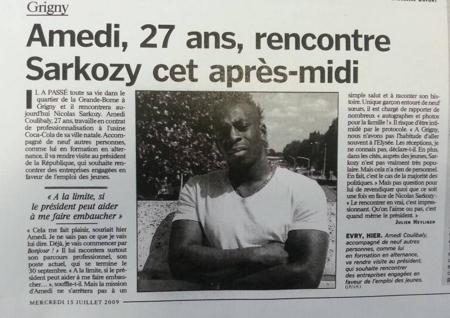 El rotativo francés, como pueden ver en la imagen, titulaba: "Amedi,27 años, ve a Sarkozy esta tarde". Coulibaly se encontró con el presidente galo junto a otros nueve compañeros. "Ha pasado toda su vida en el barrio Grande-Borne en Grigny. Y él se va a encontrar con Nicolá sarkozy hoy. Amedi Culibaly trabaja con un contrato de profesionalización en la fábrica de Coca Cola de su ciudad natal. Acompañado de otras nueve personas que como él están en formación por turnos va a visitar al presidente de la República que desea reunirse con empresas comprometidas a favor del empleo de los jóvenes", decía el diario.