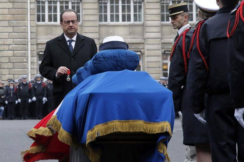 El presidente de Francia, François Hollande, rindió este martes homenaje a los tres policías asesinados la semana pasada en los atentados de París, de los que dijo que murieron "con valentía y dignidad" en el cumplimiento de su trabajo.