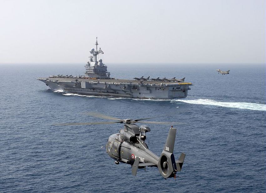 Le acompañan además como refuerzo un grupo aeronaval compuesto por una fragata de defensa antiaérea, un submarino nuclear de ataque y un petrolero para su suministro, por lo que, según resume el diario Le Parisien, se trata de un "pequeño Ejército".