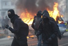 comentarios Los manifestantes se enfrentaron a la policía a pedradas e incendiaron contenedores de basura en el centro de la capital financiera alemana.