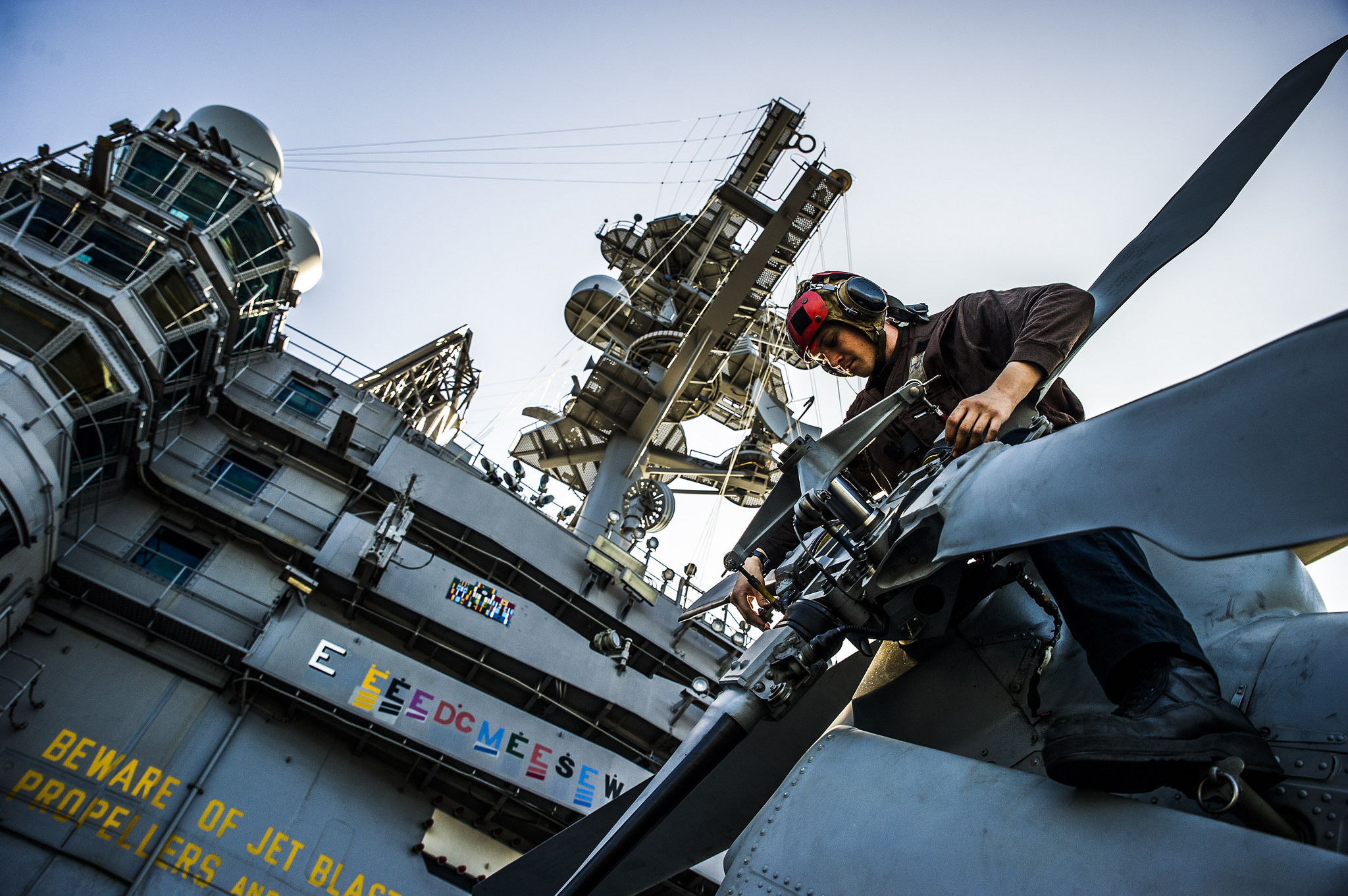 Un soldado de la US Navy repara una de las hélices de un helicóptero.