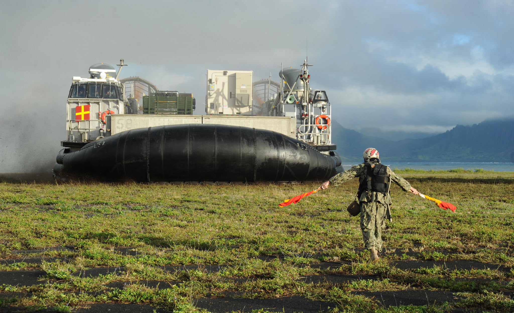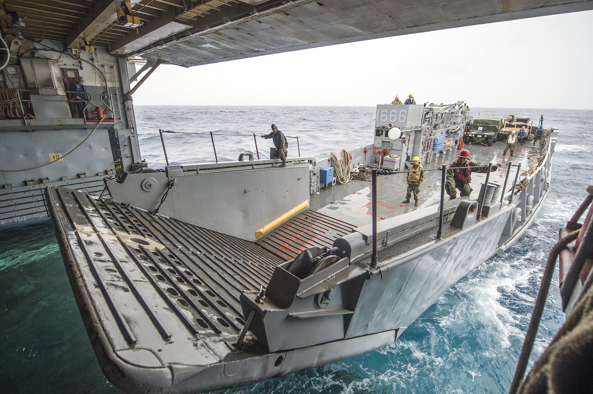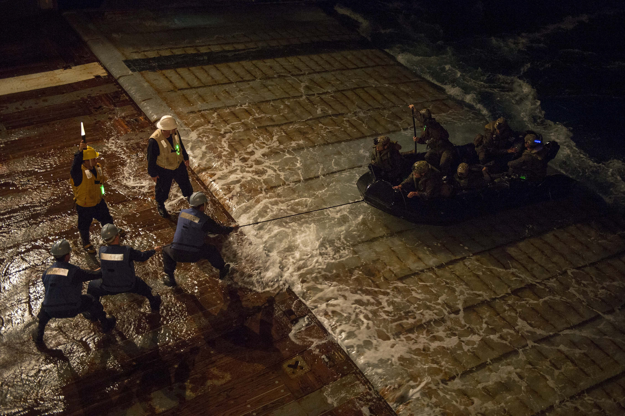Varios soldados intentan subir una lancha anfibia al USS Germantown.