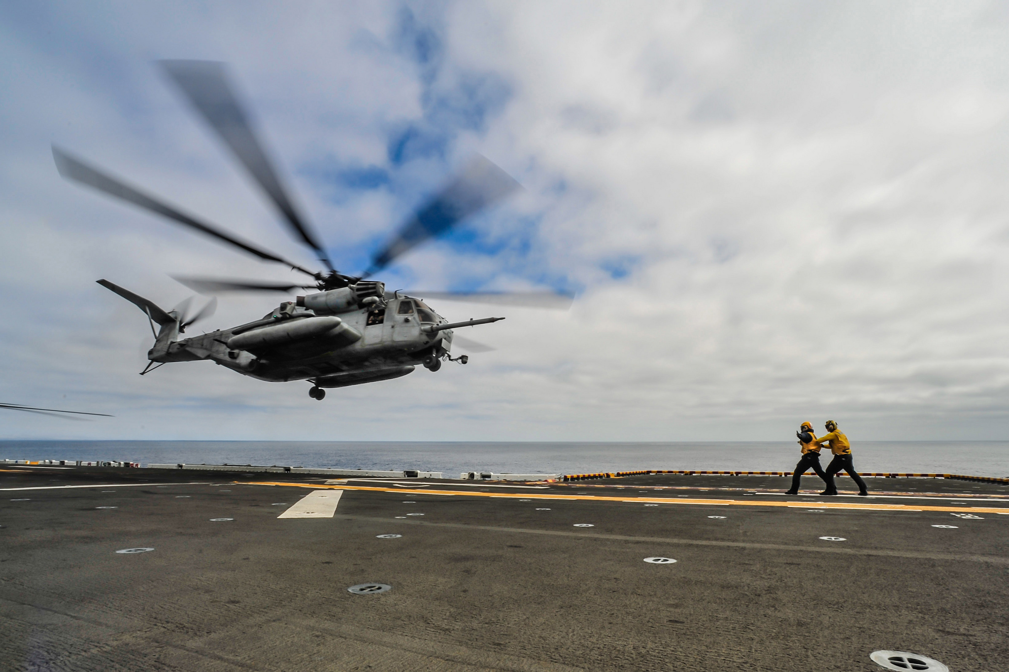 Un helicóptero se posa sobre la cubierta del USS Boxer mientras dos operarios esperan.