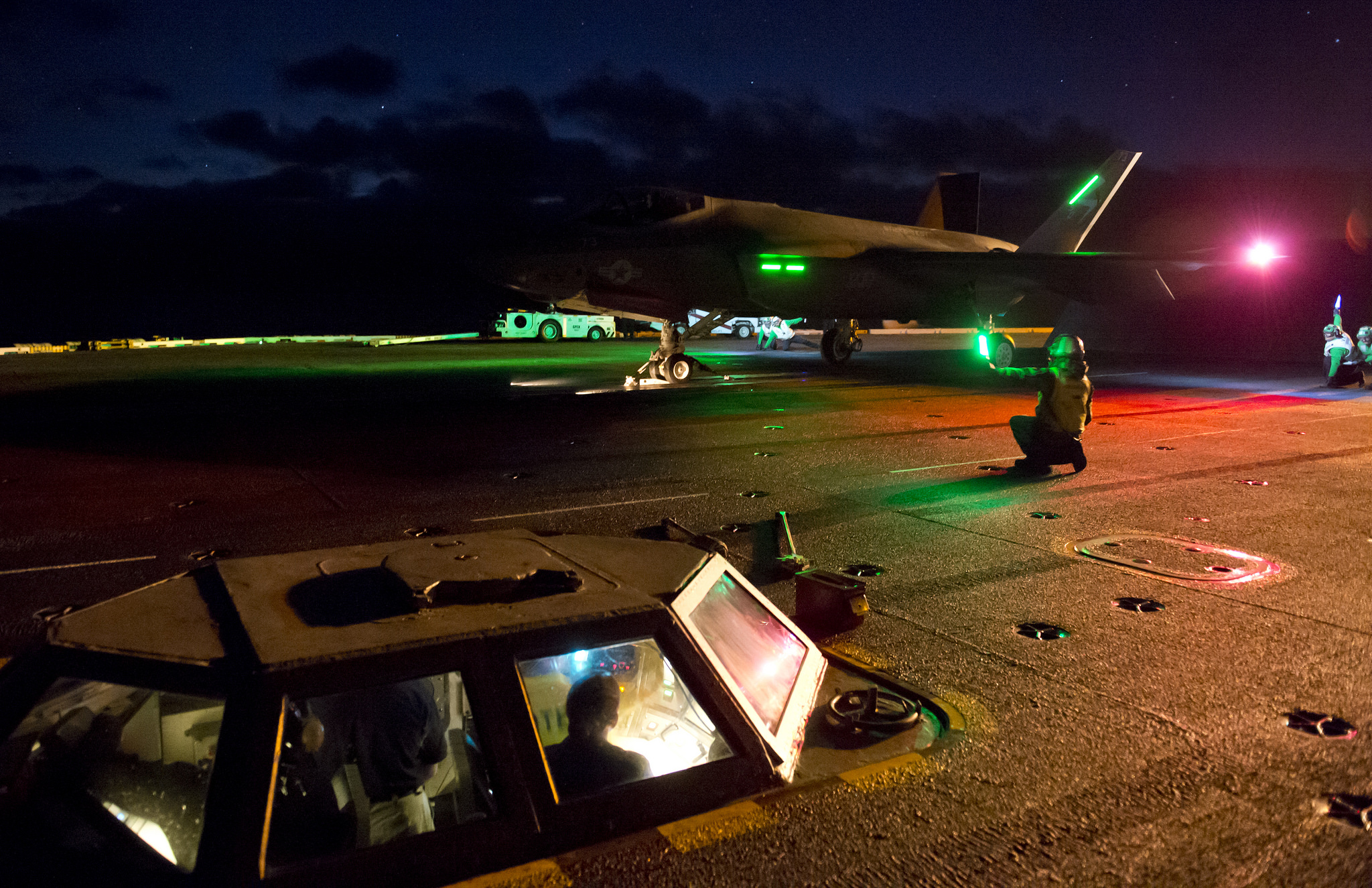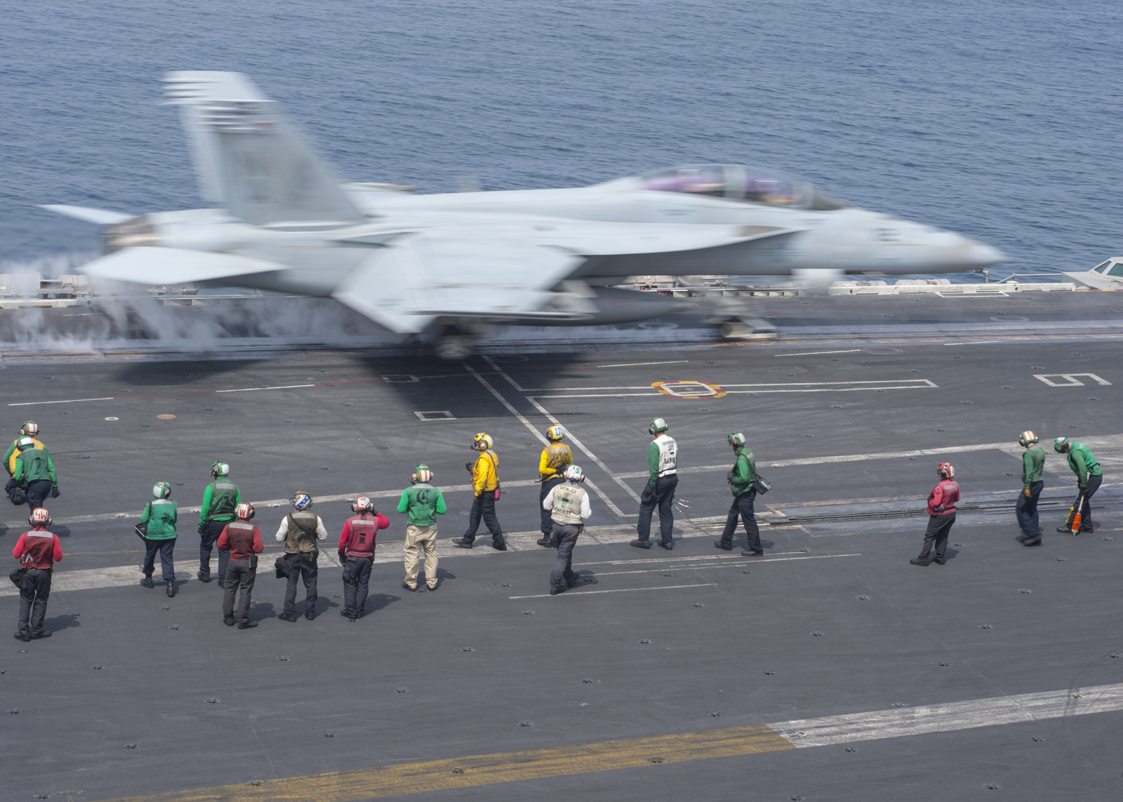 Un operario de cubierta da indicaciones sobre el USS George H.W. Bush.