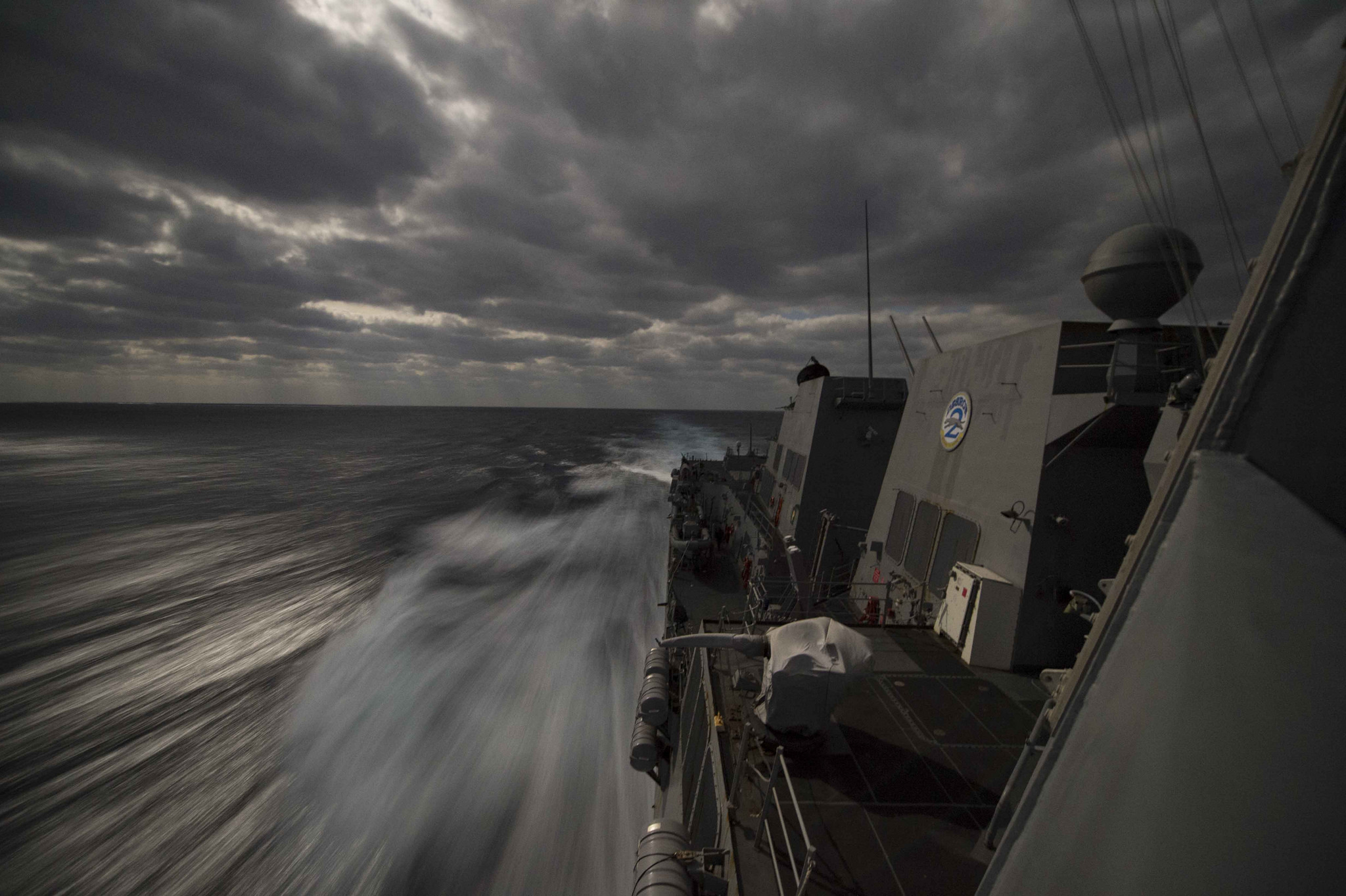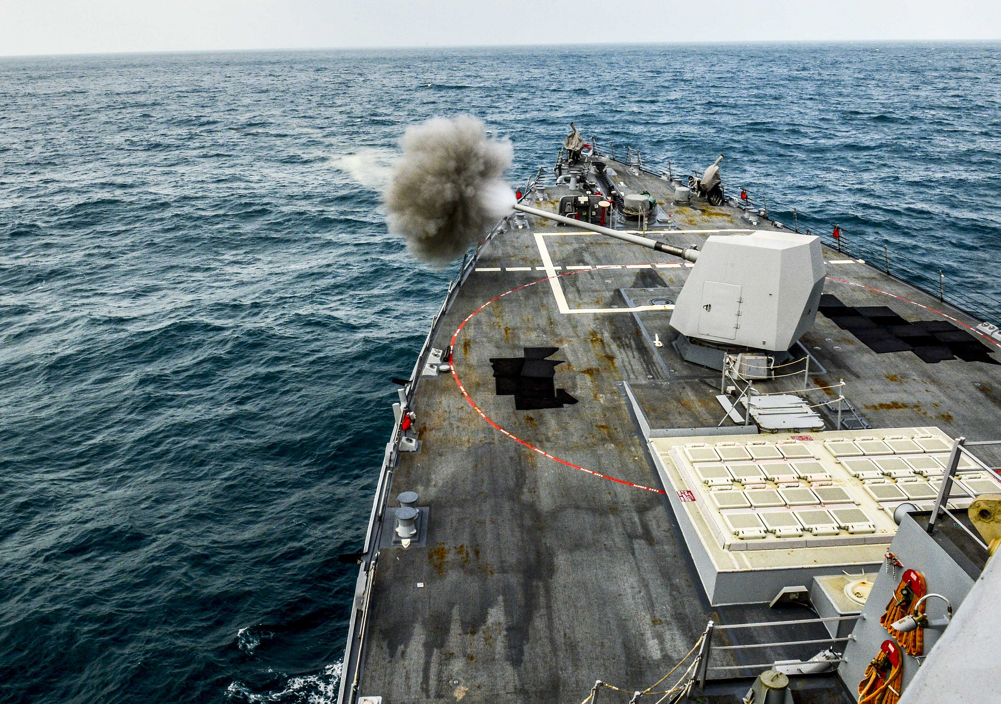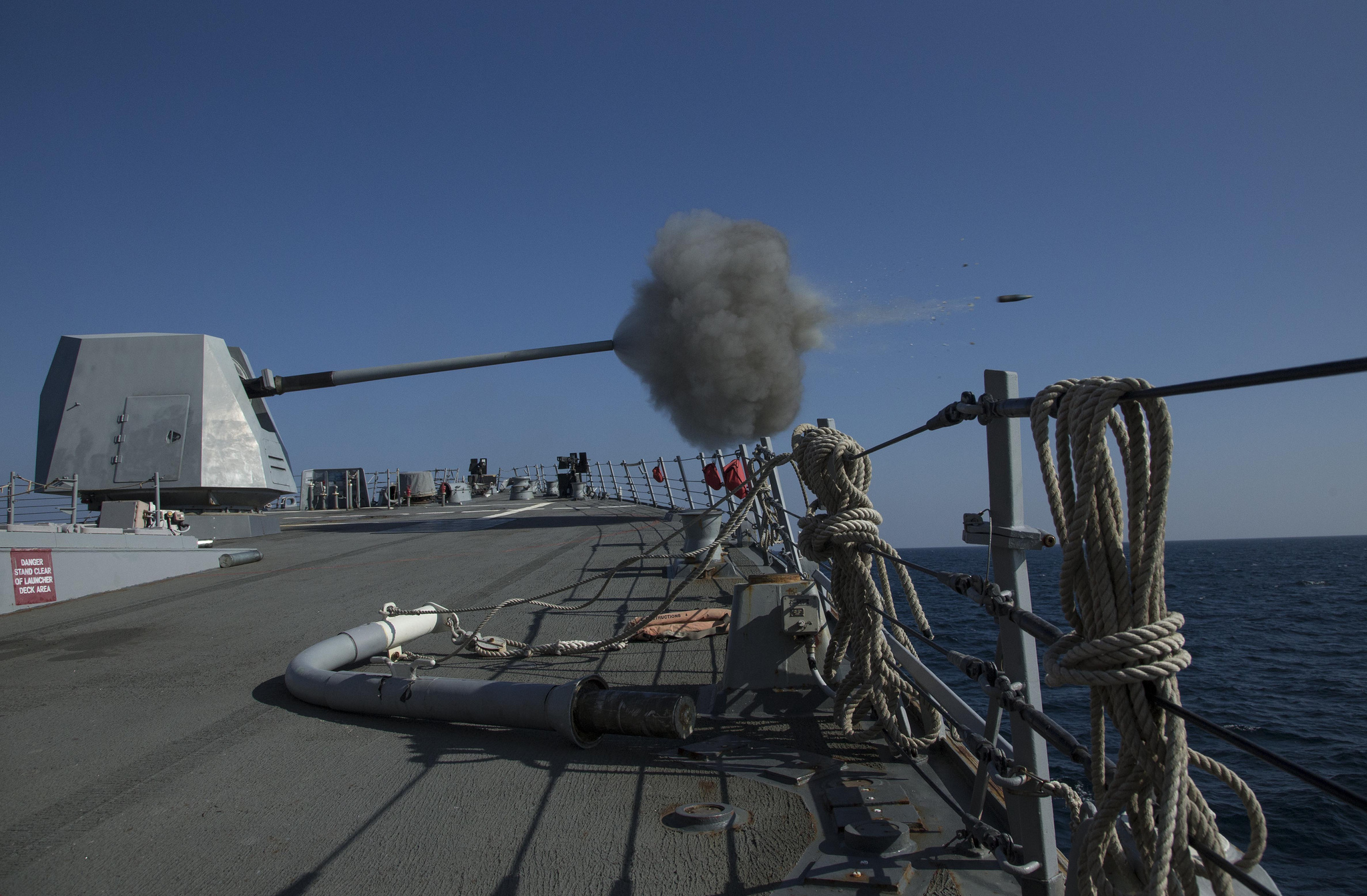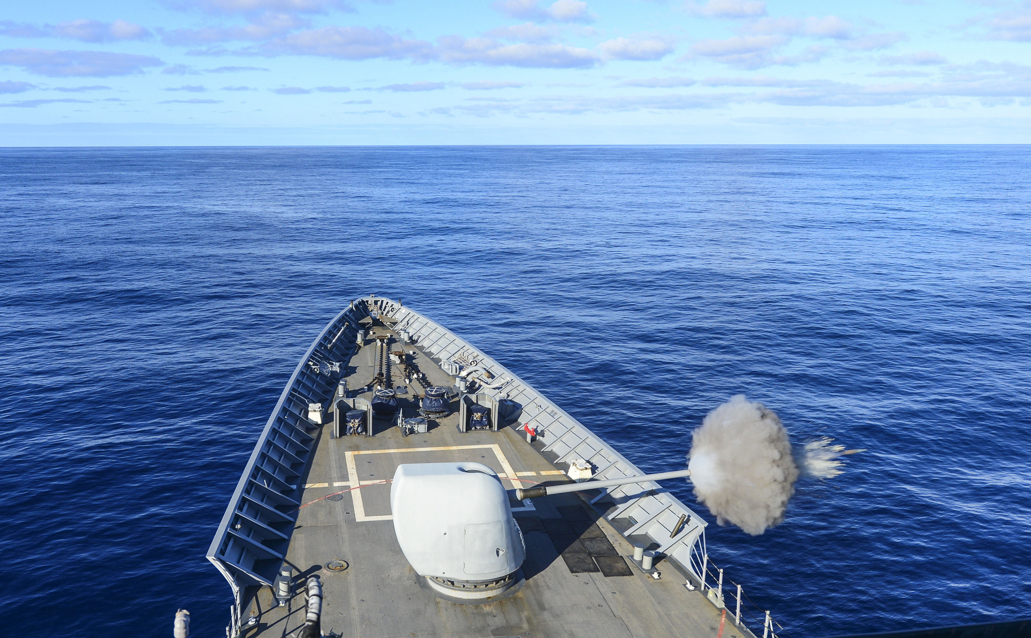 Un cañón de artillería realiza maniobras de fuego real sobre el USS Sterett.