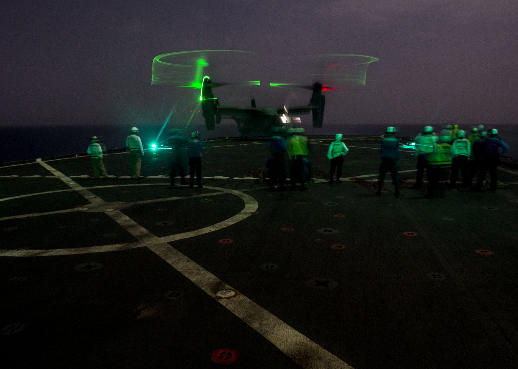 Un helicópter de la fuerza aérea CV-22B Osprey aterriza sobre el USS Gunston.
