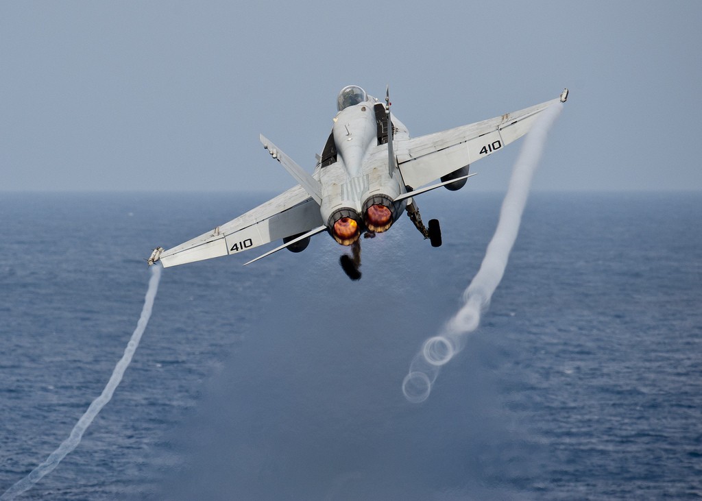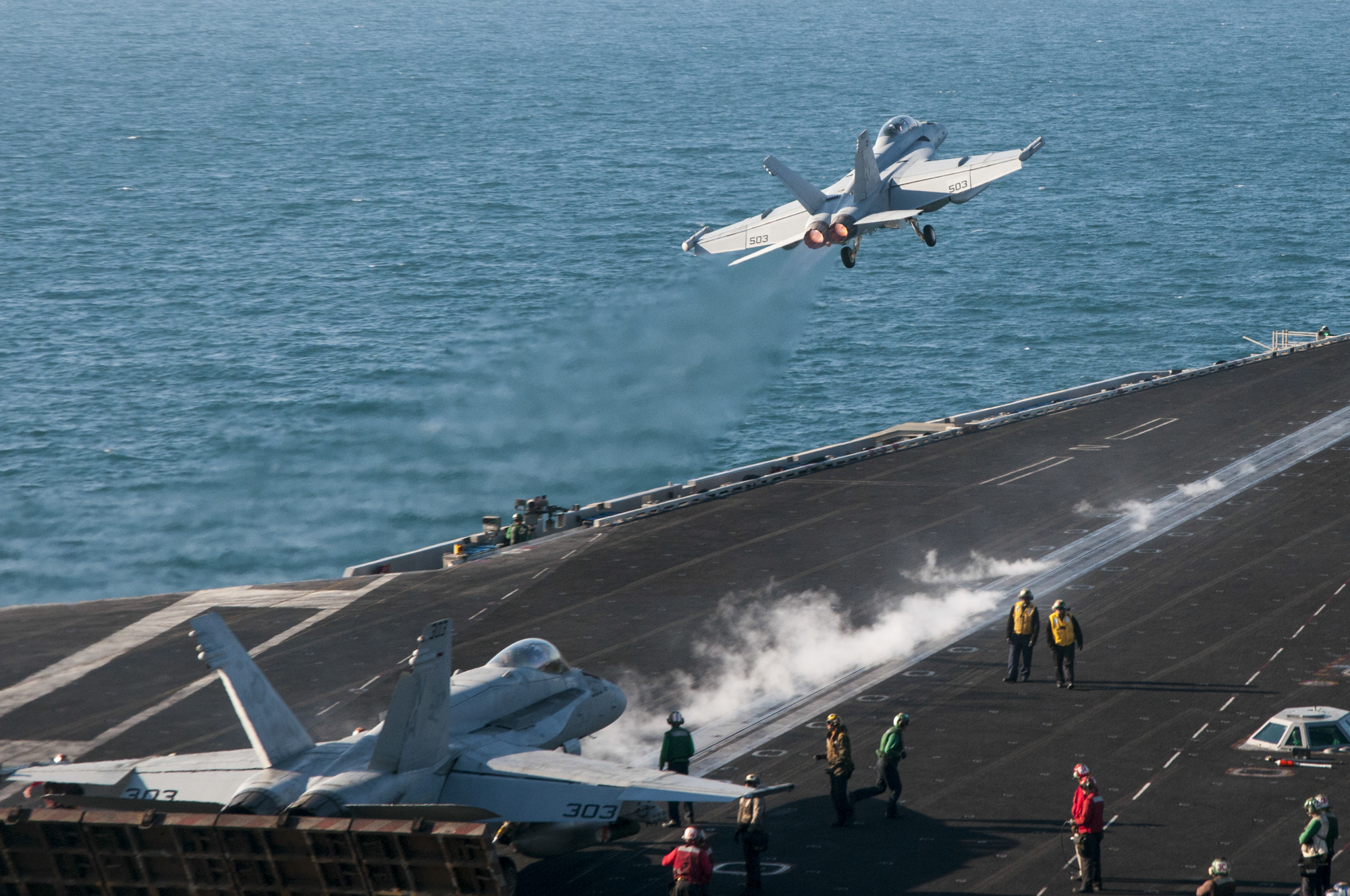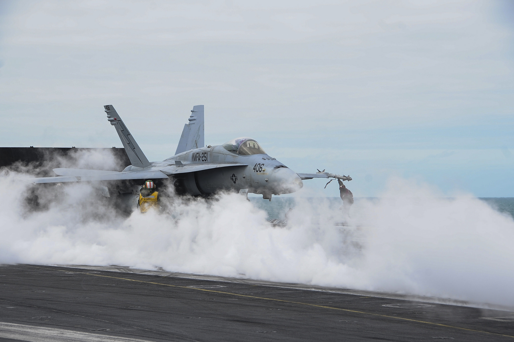 Un caza F-18 procede a despegar desde el USS George Washington.
