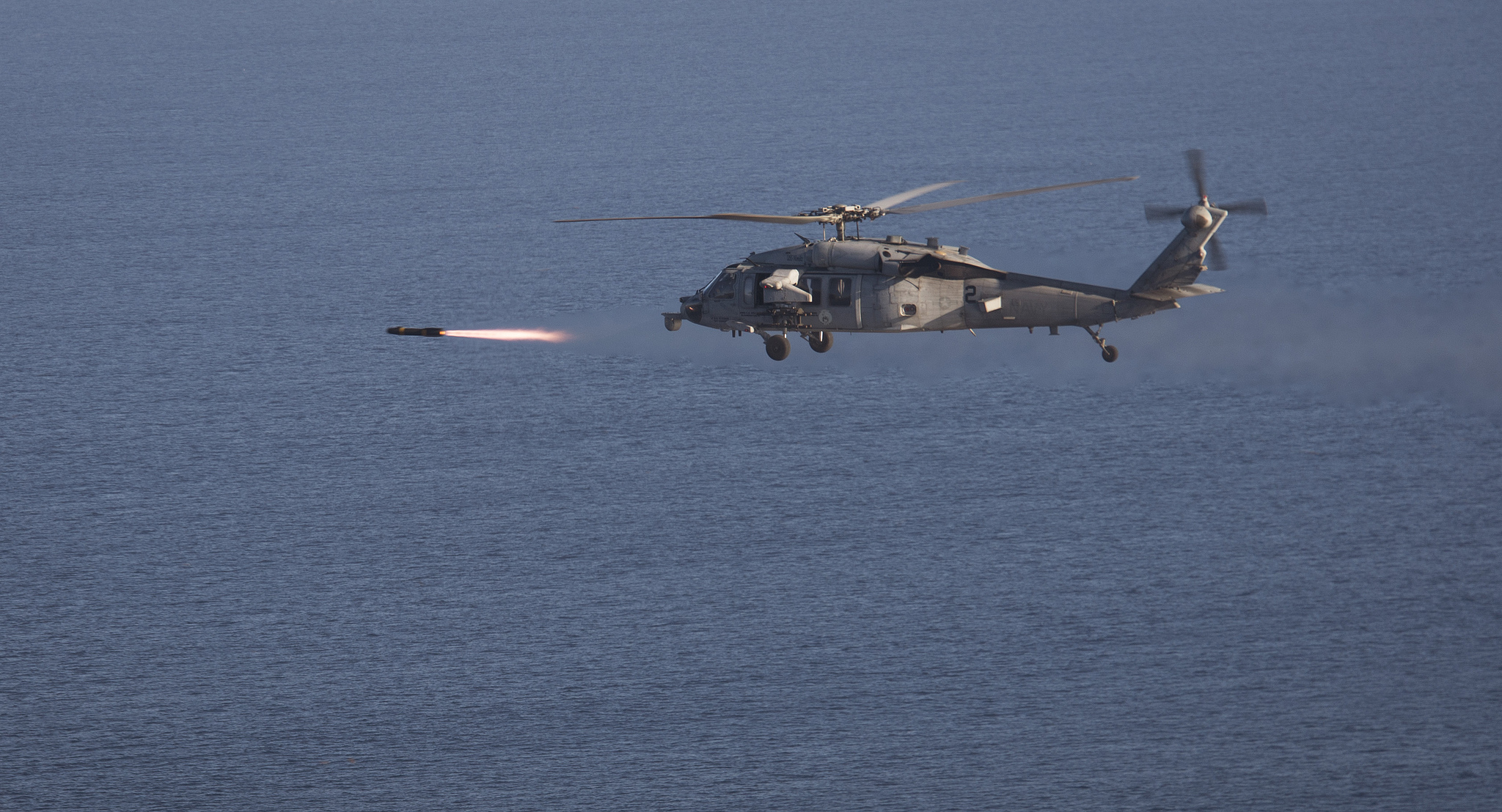 Dos helicópteros realizan una operación de maniobras sobre el USS Mesa Verde.
