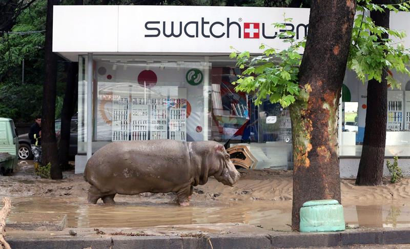 Las torrenciales lluvias que azotaron Tbilisi (Georgia), en las que murieron 17 personas, provocaron que numerosos animales escaparan del zoológico de la ciudad, después de que las inundaciones destruyeran sus recintos. Tigres, leones, osos o un hipopótamo escaparon de las instalaciones. La mayor parte de las fieras murieron.