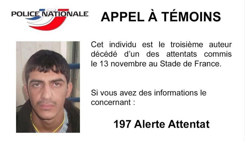 La foto fue difundida en la cuenta oficial de Twitter de la Policía con el texto: "Este individuo es el tercer autor fallecido de uno de los atentados cometidos el 13 de noviembre en el Estadio de Francia". Los agentes instaron a todo aquel que pueda tener datos sobre ese individuo a llamar al teléfono 197.