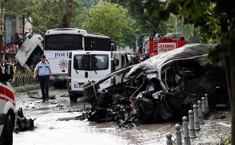 Al menos 11 personas han muerto y 36 han resultado heridas al estallar hoy un coche bomba al paso de un autobús policial en el centro histórico de Estambul.