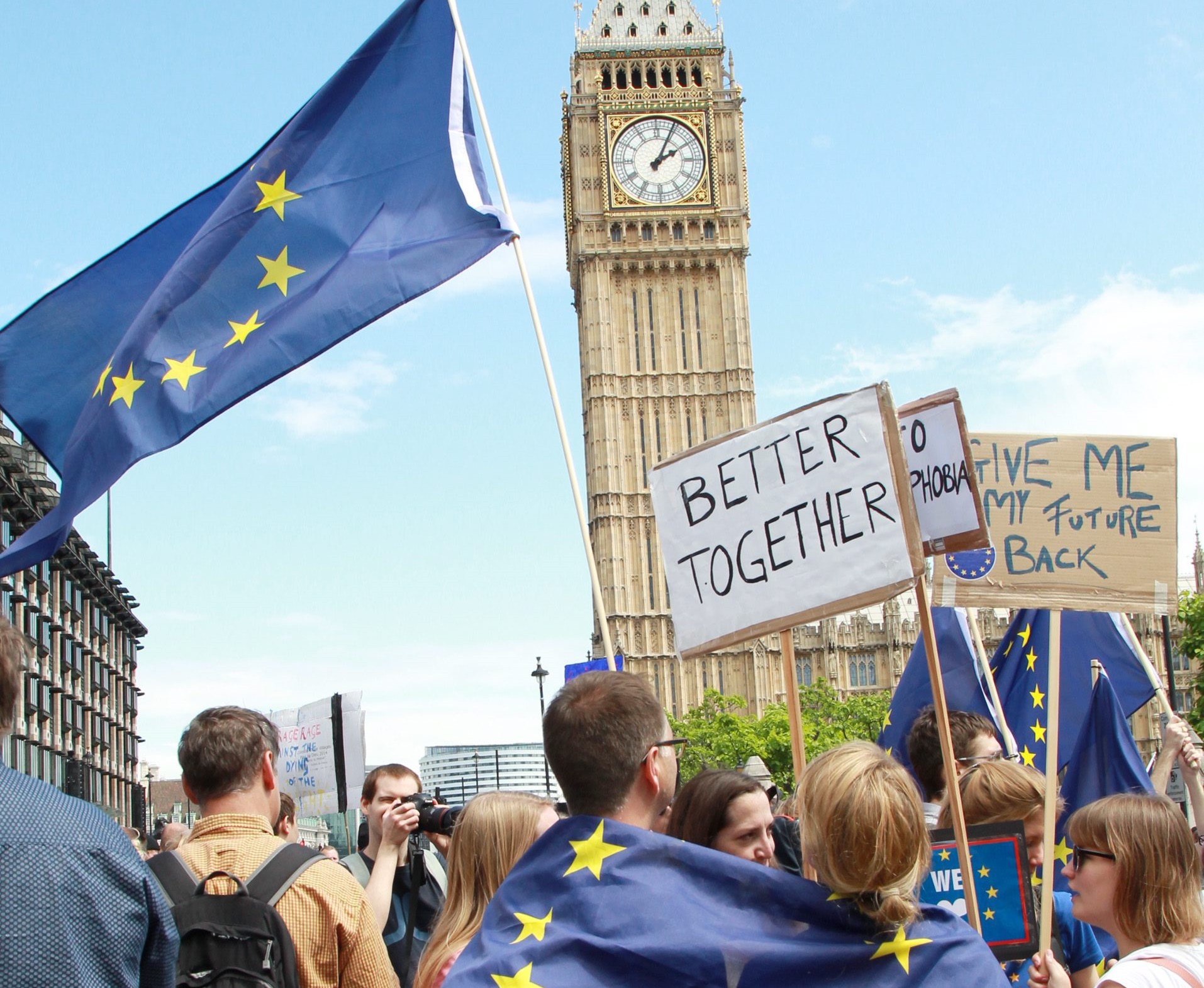 Con pancartas que dicen "bremain" (lo opuesto a "brexit") y "UE te queremos", jóvenes y familias con niños pequeños se sumaron a la marcha que pasó por Downing Street, la residencia del primer ministro británico, el conservador David Cameron, cerca del Parlamento.