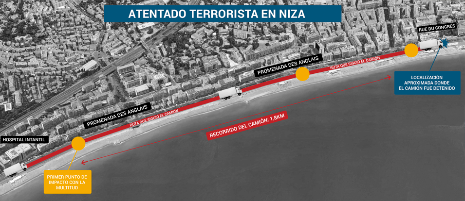 A las 23:45 del jueves por la noche el conductor de un camión frigorífico de 19 toneladas, alquilado el pasado 11 de julio en una localidad cercana a Niza, entró en la calle Promenade des Anglais (Paseo de los Ingleses) y circuló a lo largo de 2 kilómetros, entre el número 147 y el 11 de calle, golpeando a numerosos espectadores reunidos en el paseo marítimo para presenciar los tradicionales fuegos artificiales de la Fiesta Nacional.