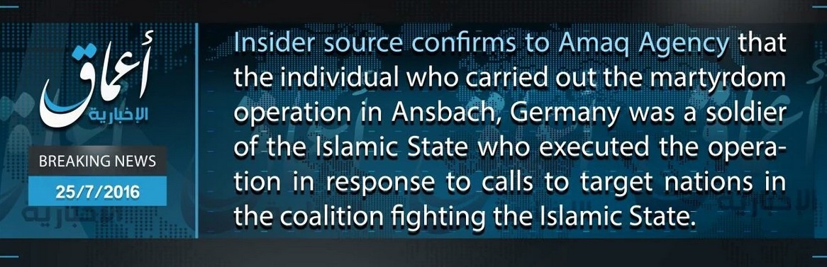 Una de las agencias de noticias oficiales de Estado Islámico ha emitido un despacho en las últimas horas en la que el grupo terrorista califica de "soldado del califato" al refugiado sirio que se ha hecho explotar en Ansbach al tiempo que afirma que "llevó a cabo la operación en respuesta a los llamamientos a atacar a los países de la coalición que lucha contra el Estado Islámico", según recogen consultas de seguridad e inteligencia como AICS o Site Group.