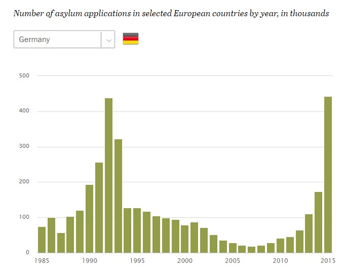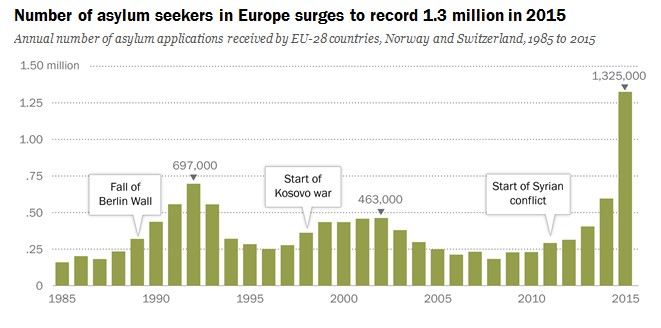Algo más de 1,3 millones de emigrantes solicitaron asilo en la UE -incluyendo Suiza y Noruega- el pasado año, una cifra récord, ya que casi duplica el anterior máximo registrado en 1992, tras la caída del Muro de Berlín (697.000 refugiados), o las 463.000 peticiones alcanzadas en 2002 como consecuencia de la Guerra de Kosovo a finales de los años 90, tal y como señala un estudio elaborado por Pew Research Center.