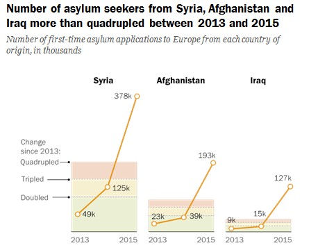 El número de refugiados procedentes de estos tres países se ha multiplicado por cuatro desde 2013, hasta alcanzar los 378.000 sirios en 2015 (el 29% de los solicitantes de asilo), 193.000 afganos y 127.000 iraquíes.