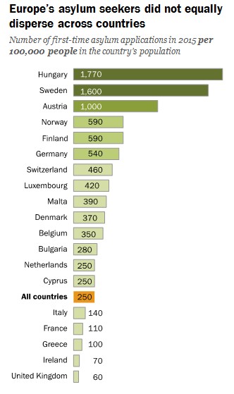En términos relativos, la UE recibió una media de 250 solicitudes por cada 100.000 habitantes. En este caso, Hungría lidera la tabla, con 1.770 solicitantes por cada 100.000 personas, seguida de Suecia (1.600) y Alemania (540). Por el contrario, Francia tan sólo registró 110 solicitudes por cada 100.000 habitantes y Reino Unido 60.
