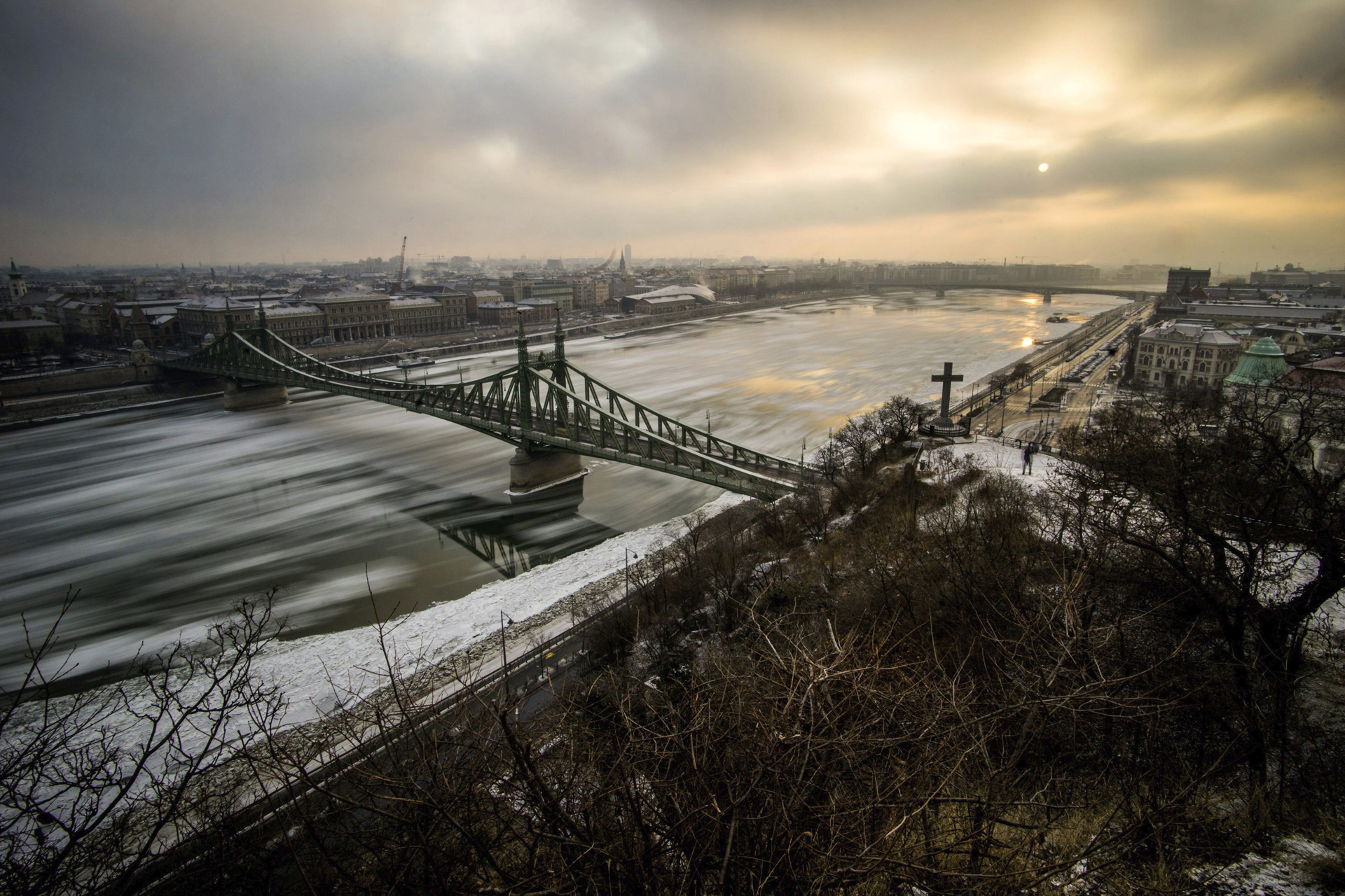 Fotografía tomada con velocidad lenta de obturación que muestra el hielo producido en el río Danubio y el puente de la Libertad en Budapest, Hungría. La ola polar ha dejado mínimas históricas: en la ciudad de Tesa se han registrado -28ºC.