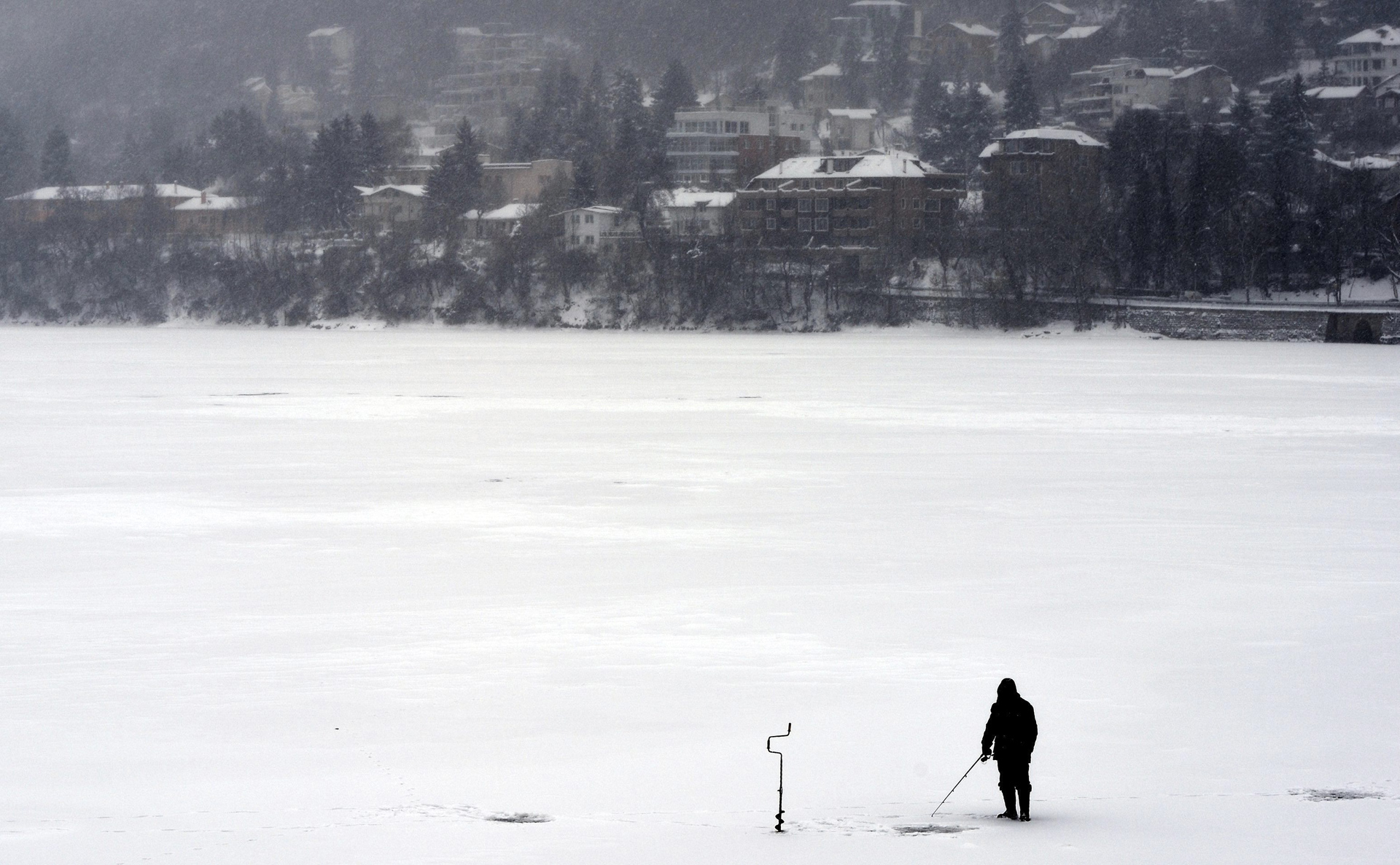 Un hombre pesca gracias a un agujero en el hielo que cubre el lago Pancharevo, cerca de Sofía (Bulgaria). En la ciudad las temperaturas oscilan entre los 14 y los 26 grados bajo cero.