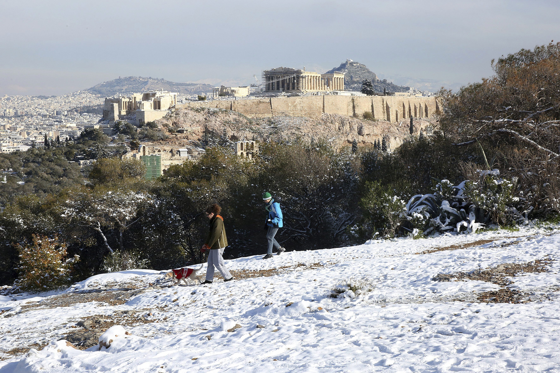 Varias personas pasean por la colina Pnyka cubierta de nieve con el Acrópolis de fondo en Atenas. La mediterránea Grecia está viviendo una de las peores olas de frío de su historia. Las temperaturas han llegado a los -15ºC.