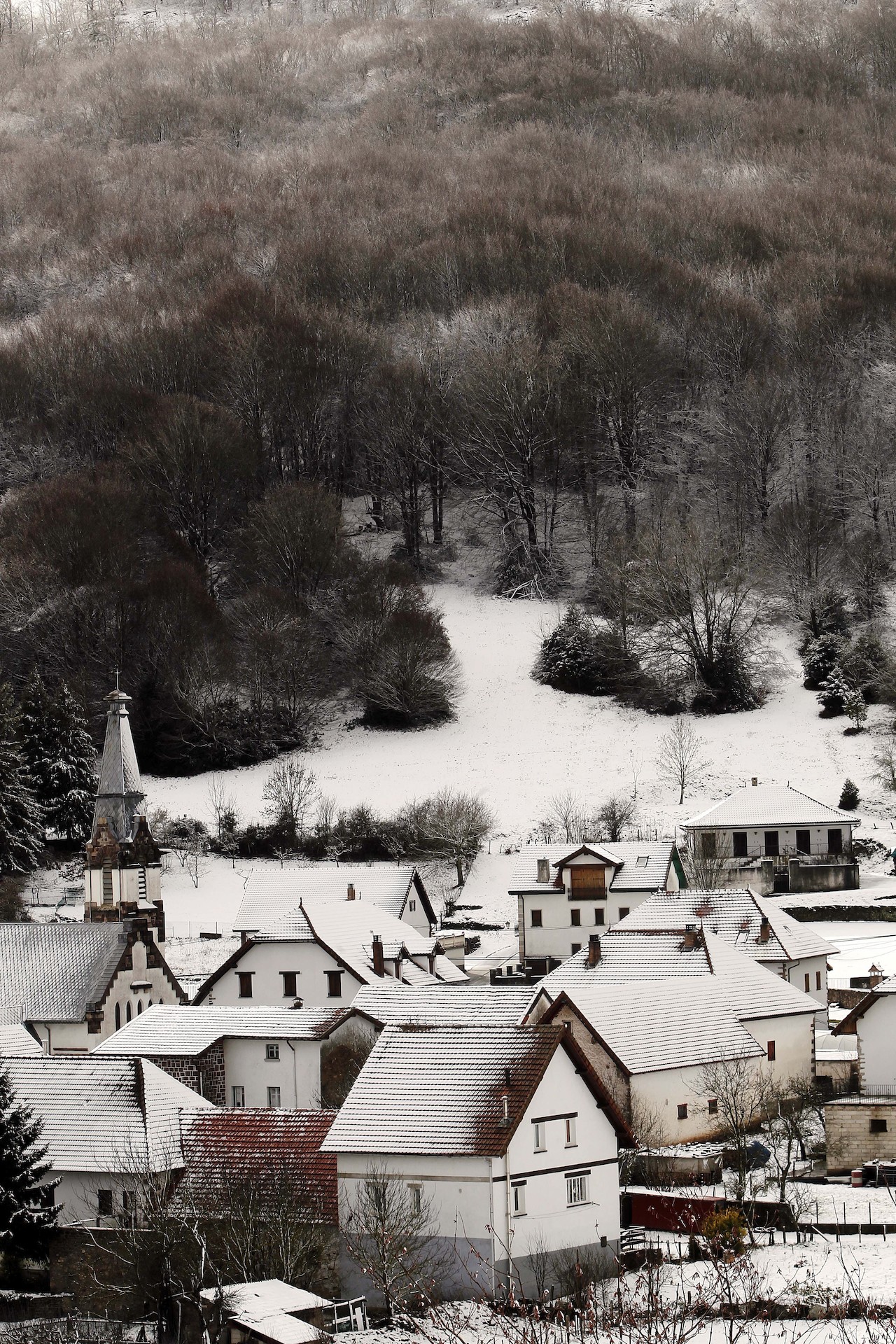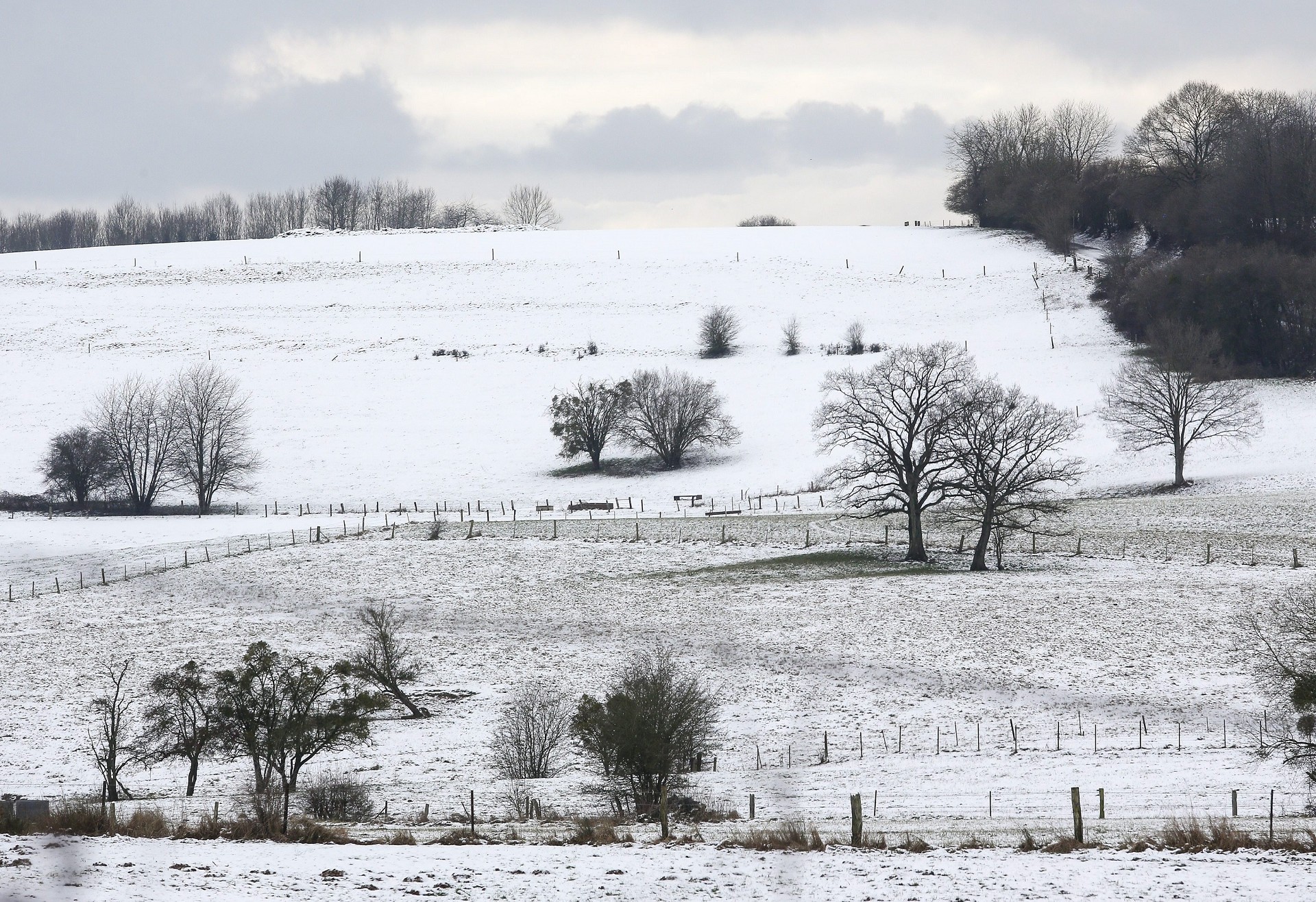 Vista de un paisaje cubierto de nieve cerca de Florenville, sur de Bélgica.