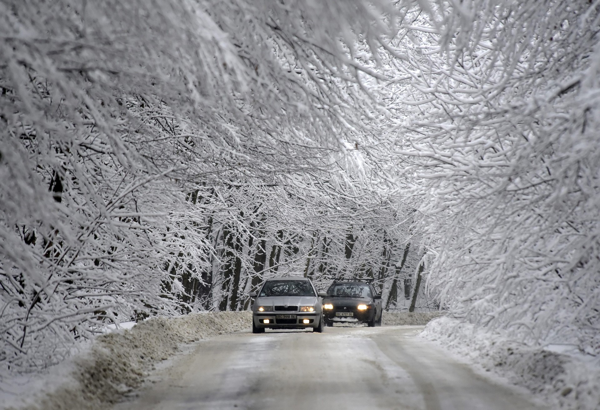 Un coche conduce en una carretera enmarcada por árboles cubiertos de nieve cerca de Lviv, Ucrania. El país experimentó condiciones de clima frío durante toda la semana.