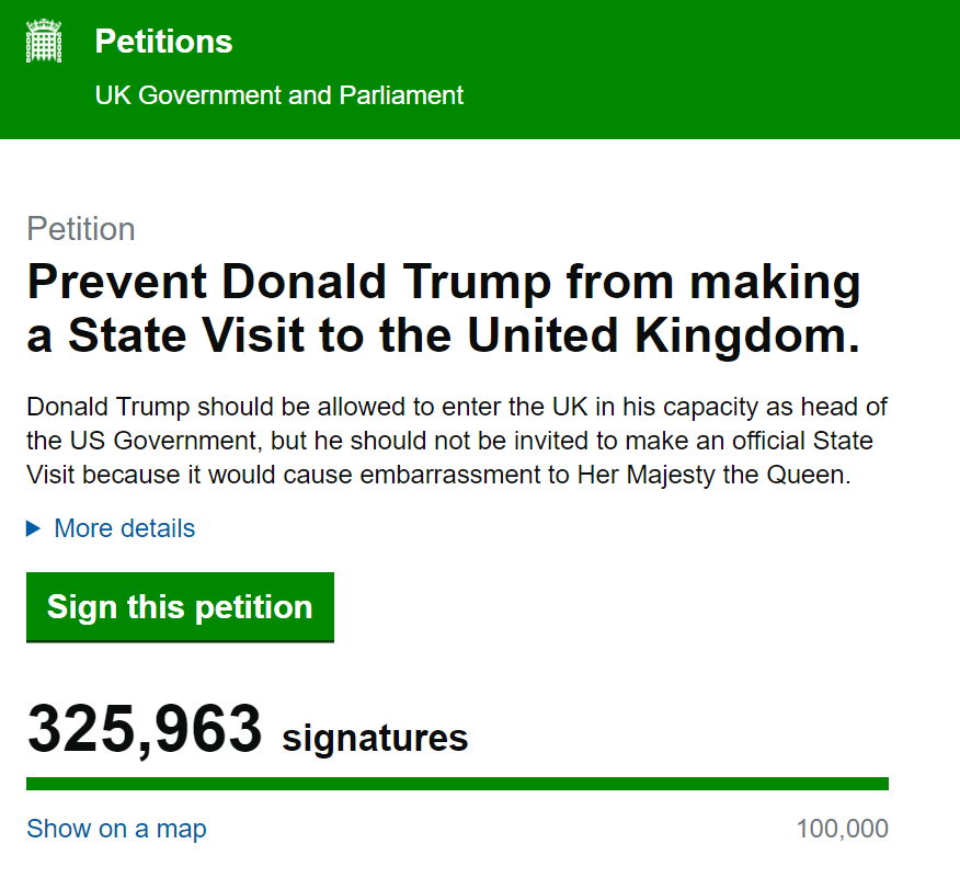 "Donald Trump debe poder entrar en Reino Unido en calidad de jefe del Gobierno de Estados Unidos, pero no se le debe invitar a realizar una visita de Estado porque sería una vergüenza para su majestad, la reina", apunta la solicitud.