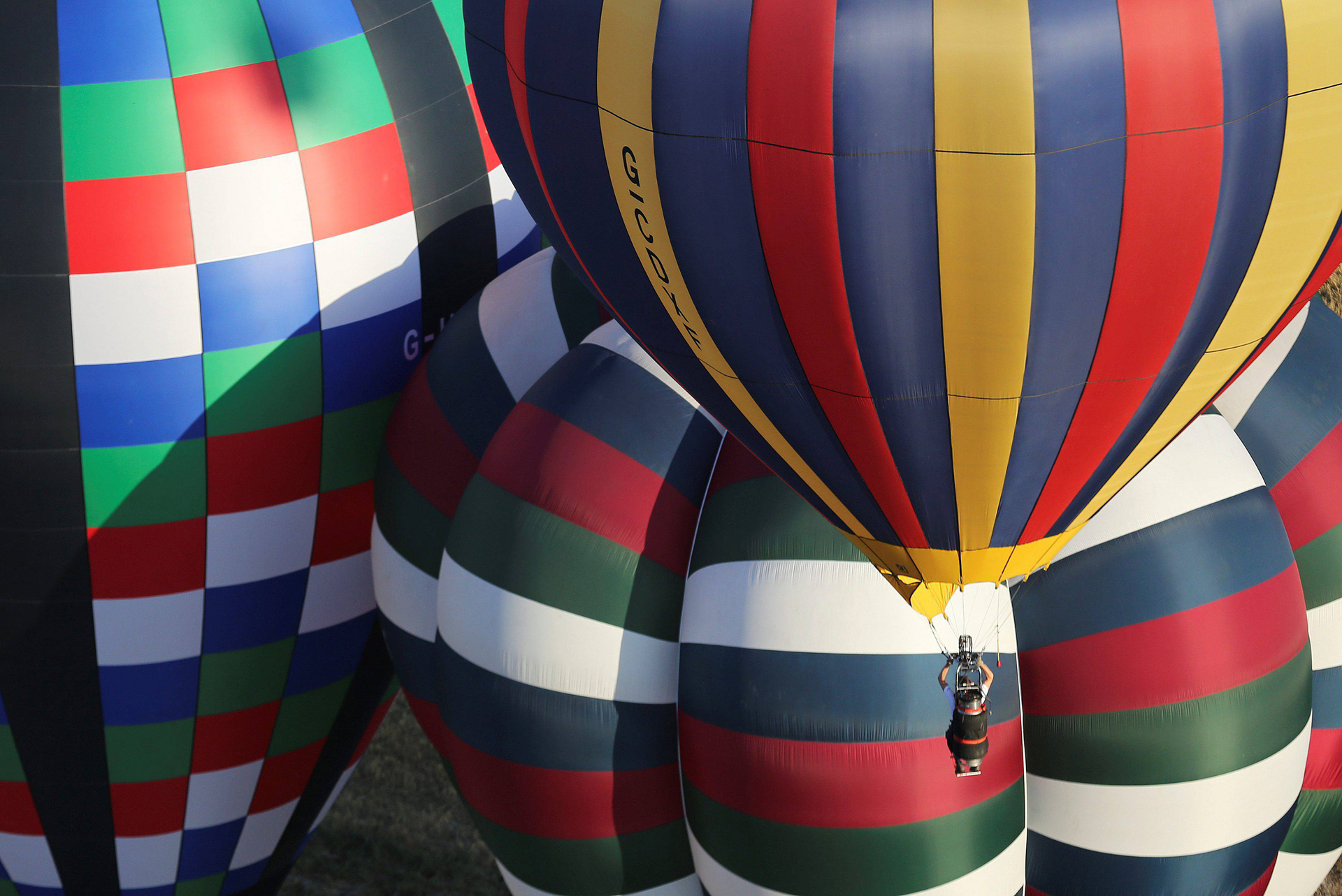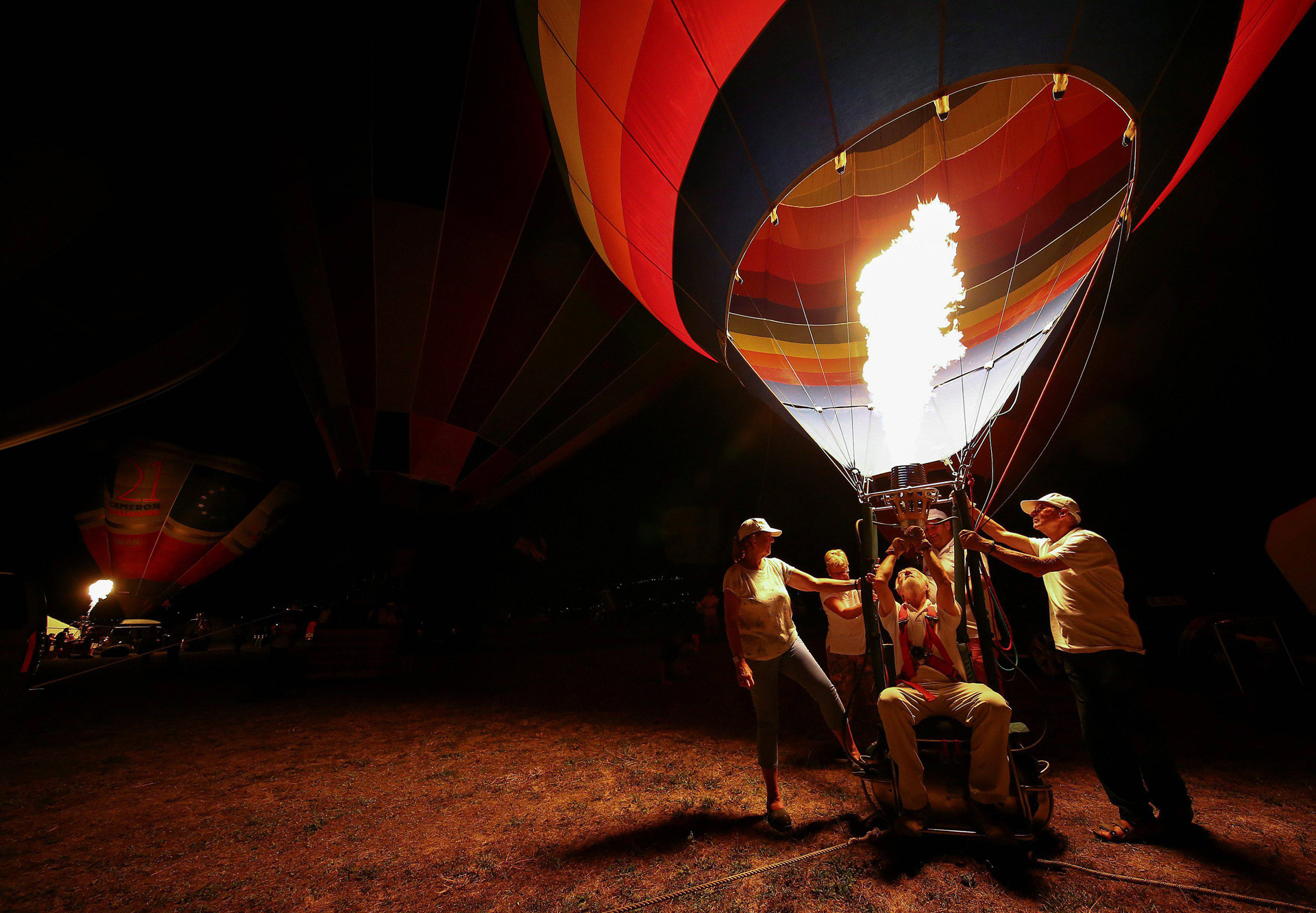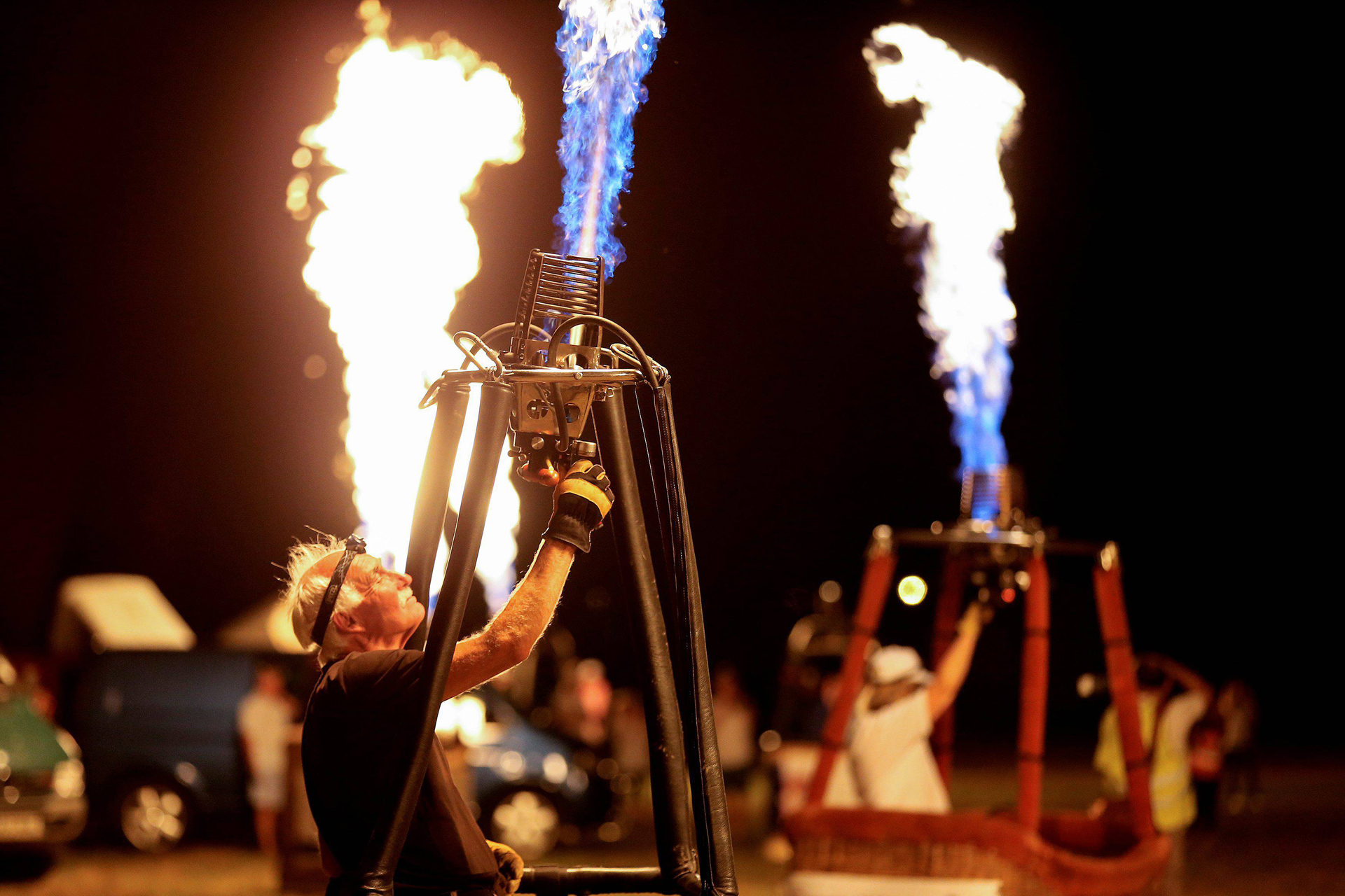 Los momentos previos al despegue de los globos, durante la puesta en marcha de los motores para calentar el aire.