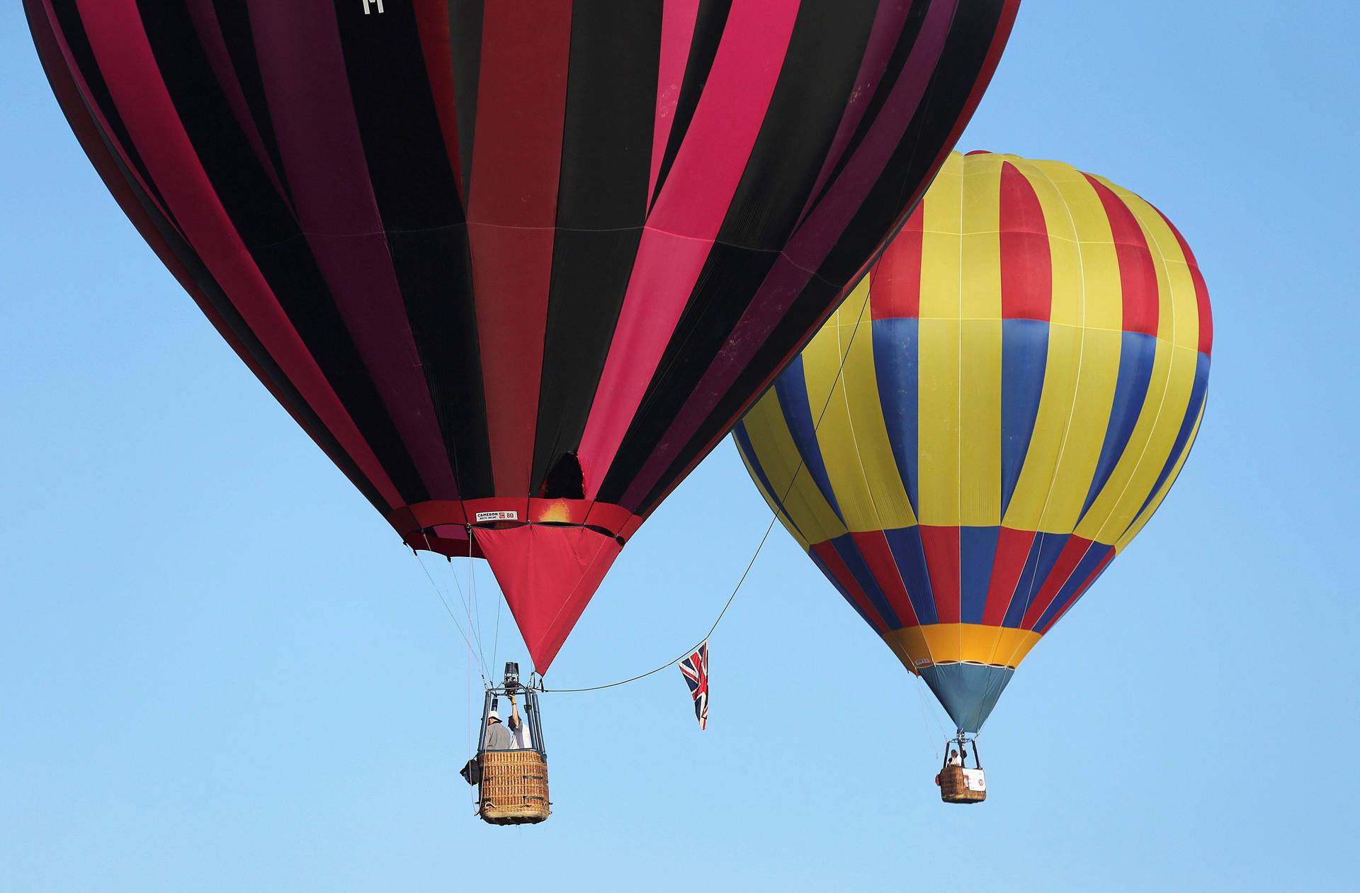 Una bandera de Reino Unido cuelga en una cuerda entre dos globos durante el festival italiano.