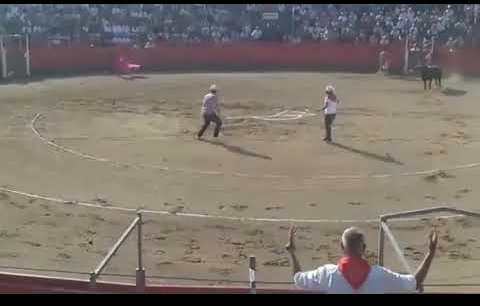 Al poco de que asomara por los toriles un novillo de la ganadería de Miura, la pareja bajó a la arena alzando los brazos, gritando y dando palmas. En estas, el animal embistió al hombre y, de no ser por la intervención del torero encargado de la lidia, Mario Palacios, el antitaurino bien hubiera podido padecer una desgracia mayor.