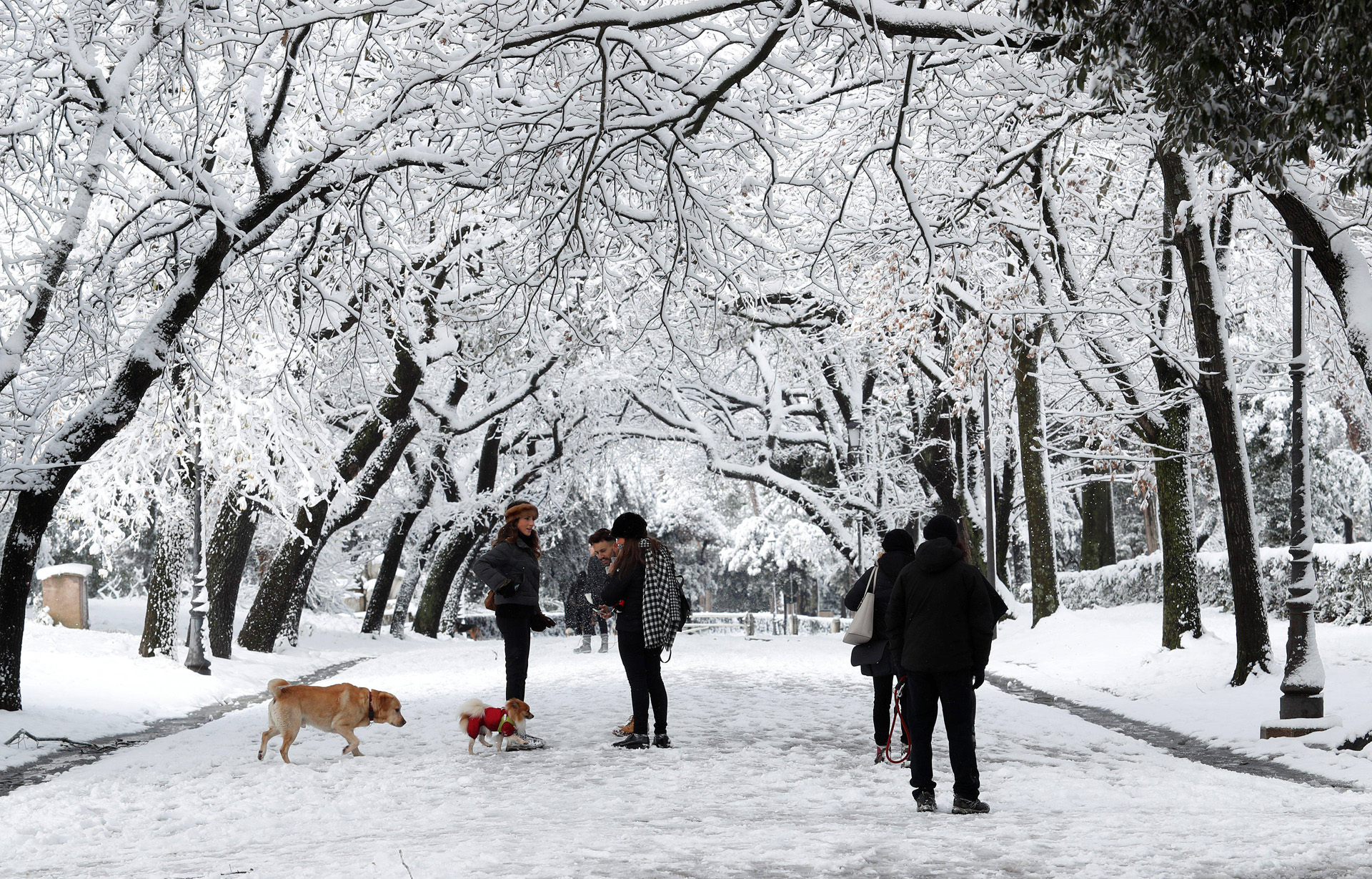 Varias personas disfrutan de la nieve en las inmediaciones de Villa Borghese.