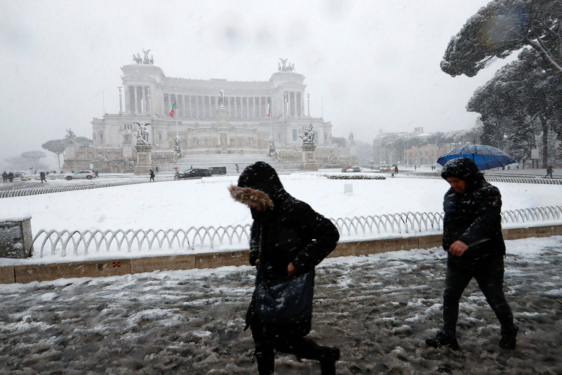 La tormenta de nieve casi no deja ver el Monumento a Víctor Manuel II en Roma.