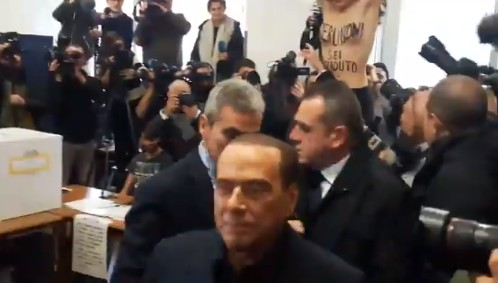 El líder de Forza Italia y ex primer ministro italiano, Silvio Berlusconi, ha depositado su papeleta en un colegio electoral de Milán después de que una activista en topless tratara de interrumpir su votación.
