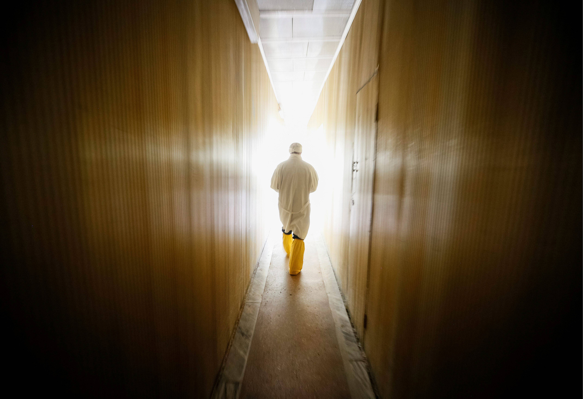 Un trabajador del complejo de Chernobyl camina por uno de los pasillos.