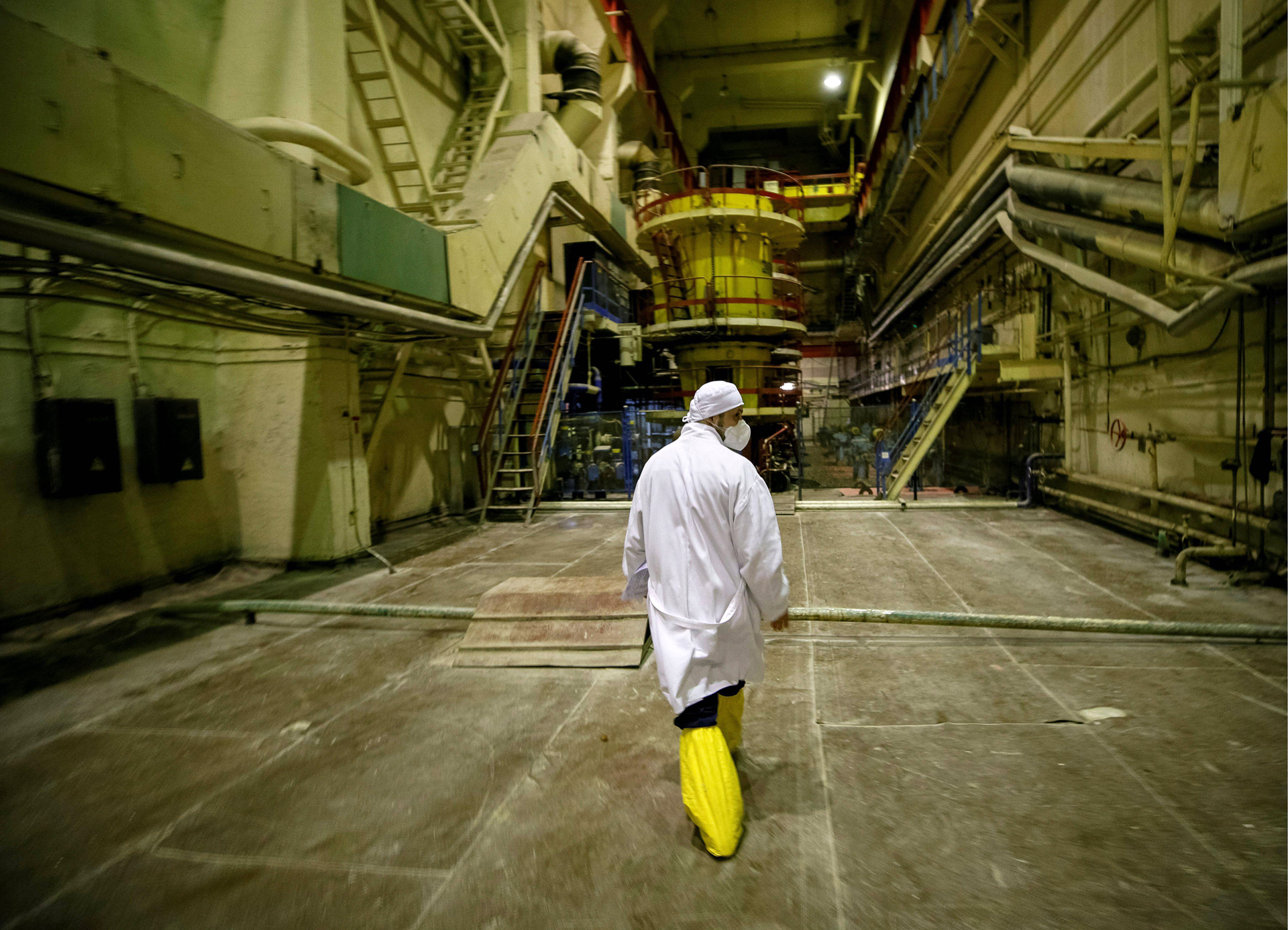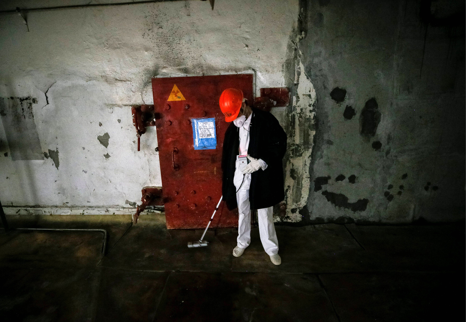 Un operario da una explicación en el interior del reactor 3 de Chernobyl.