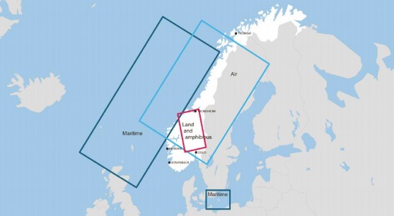 Las fuerzas terrestres desplegarán para el ejercicio en el área que comprende el sur de Trondheim y el norte de Oslo (el área en rojo). Las fuerzas marítimas, por su parte, operarán a lo largo de la costa noruega y el norte de Escocia. Además, habrá actividad marítima en el Mar de Skagerrak y el Báltico (caja azul oscuro). Las fuerzas aéreas operarán en el espacio aéreo de Noruega, Suecia y Finlandia (en azul claro).
