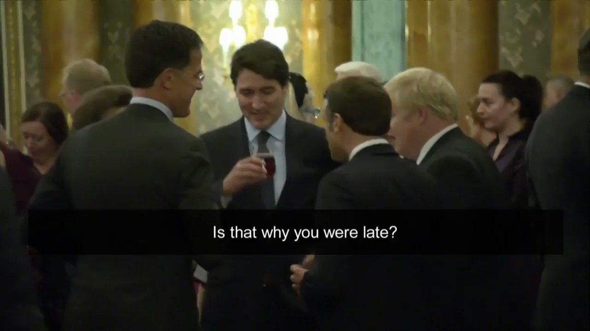 Vestidos de gala y copa en mano, se oye a Johnson preguntar a Macron: "¿Es por eso que llegaste tarde?", a lo que Trudeau contesta en tono jocoso refiriéndose supuestamente a la tendencia de Trump a alargarse en las ruedas de prensa. Posteriormente, el mismo primer ministro canadiense dice a sus colegas: "Se vio cómo la mandíbula de los miembros de su equipo caía al suelo" (en un gesto de incredulidad).