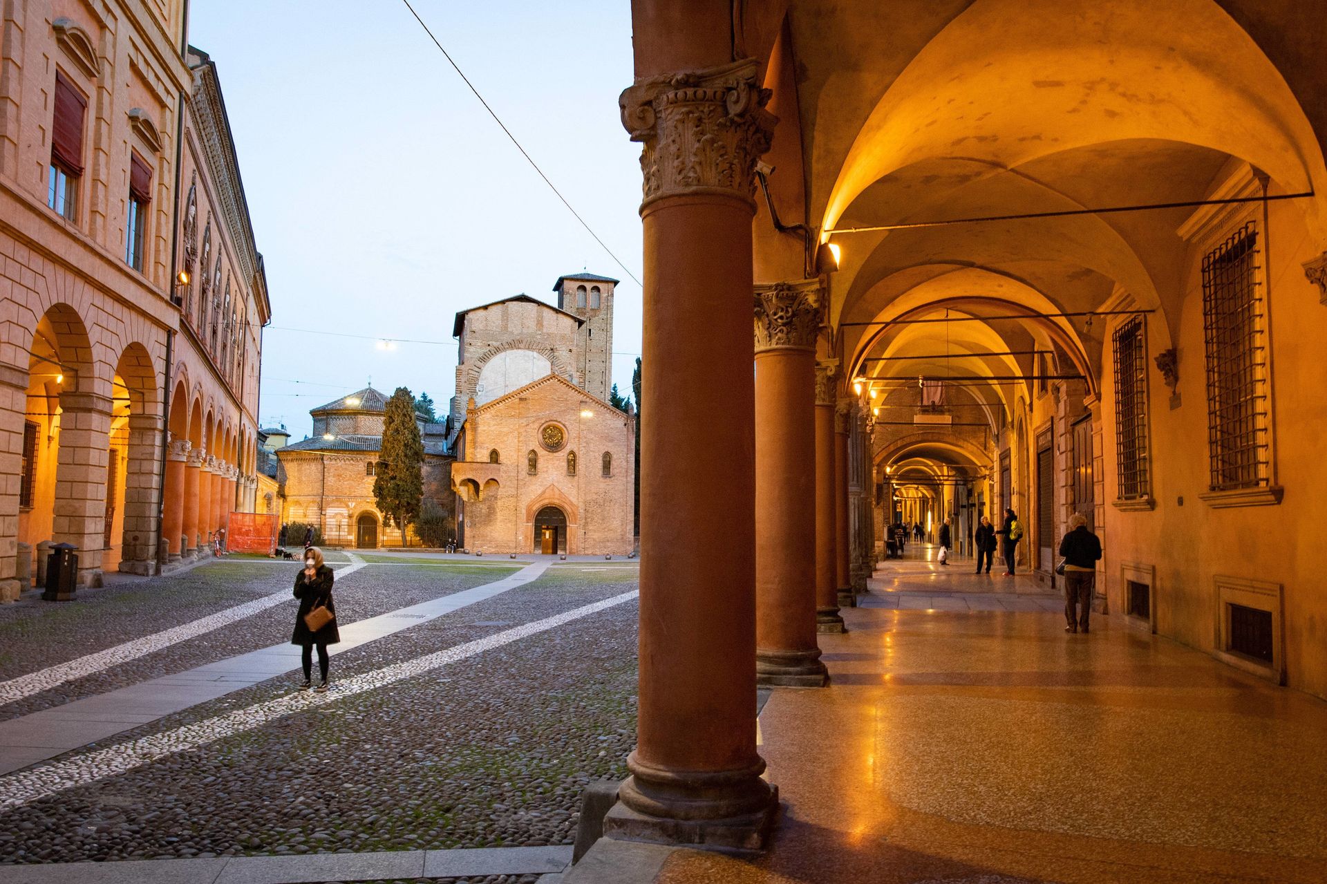 Un reducido número de personas, posiblemente vecinos, paseando por el centro de Bolonia, en Italia.