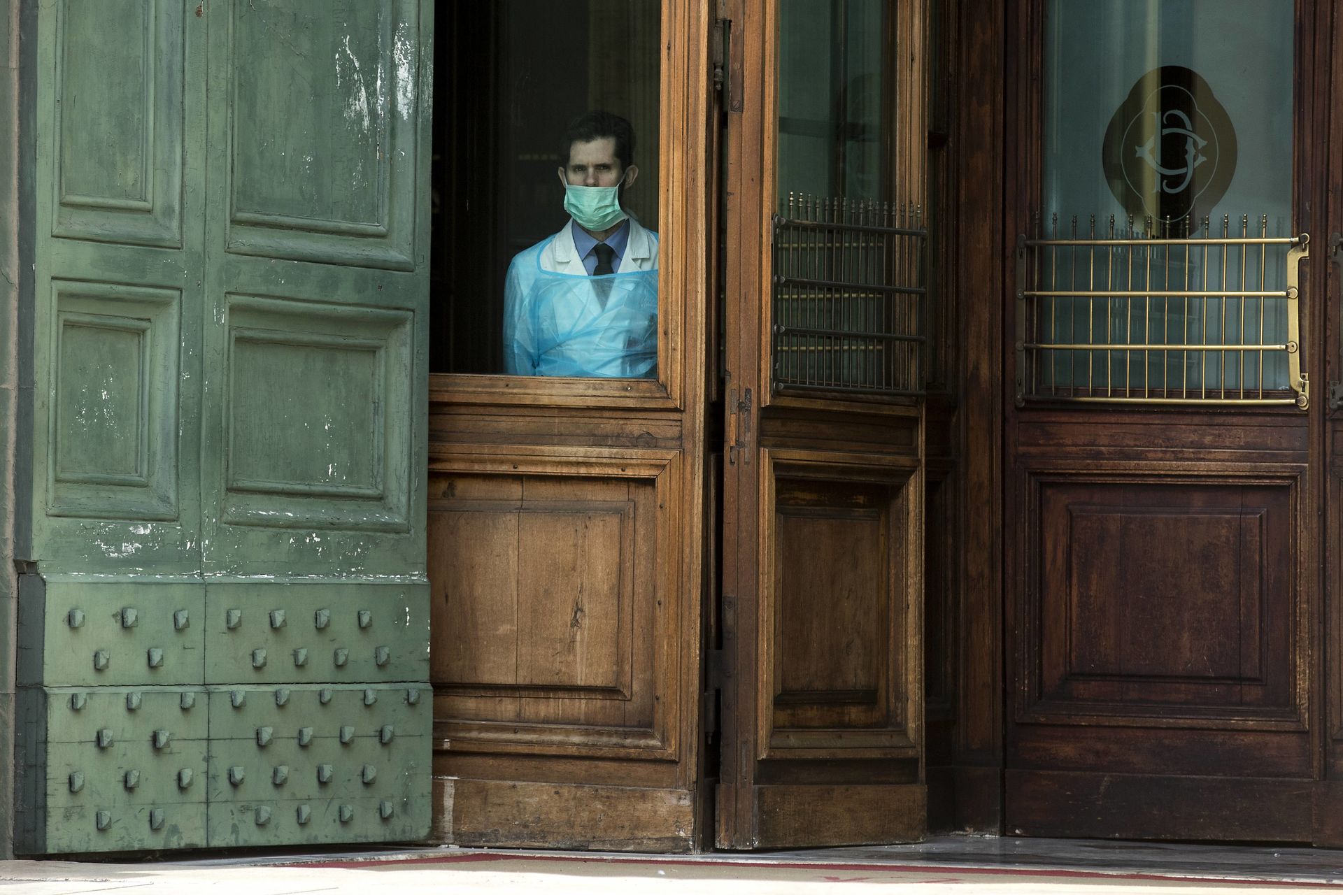 Un enfermero con mascarilla mira por una ventana en la entrada de la Cámara de Diputados en Roma.