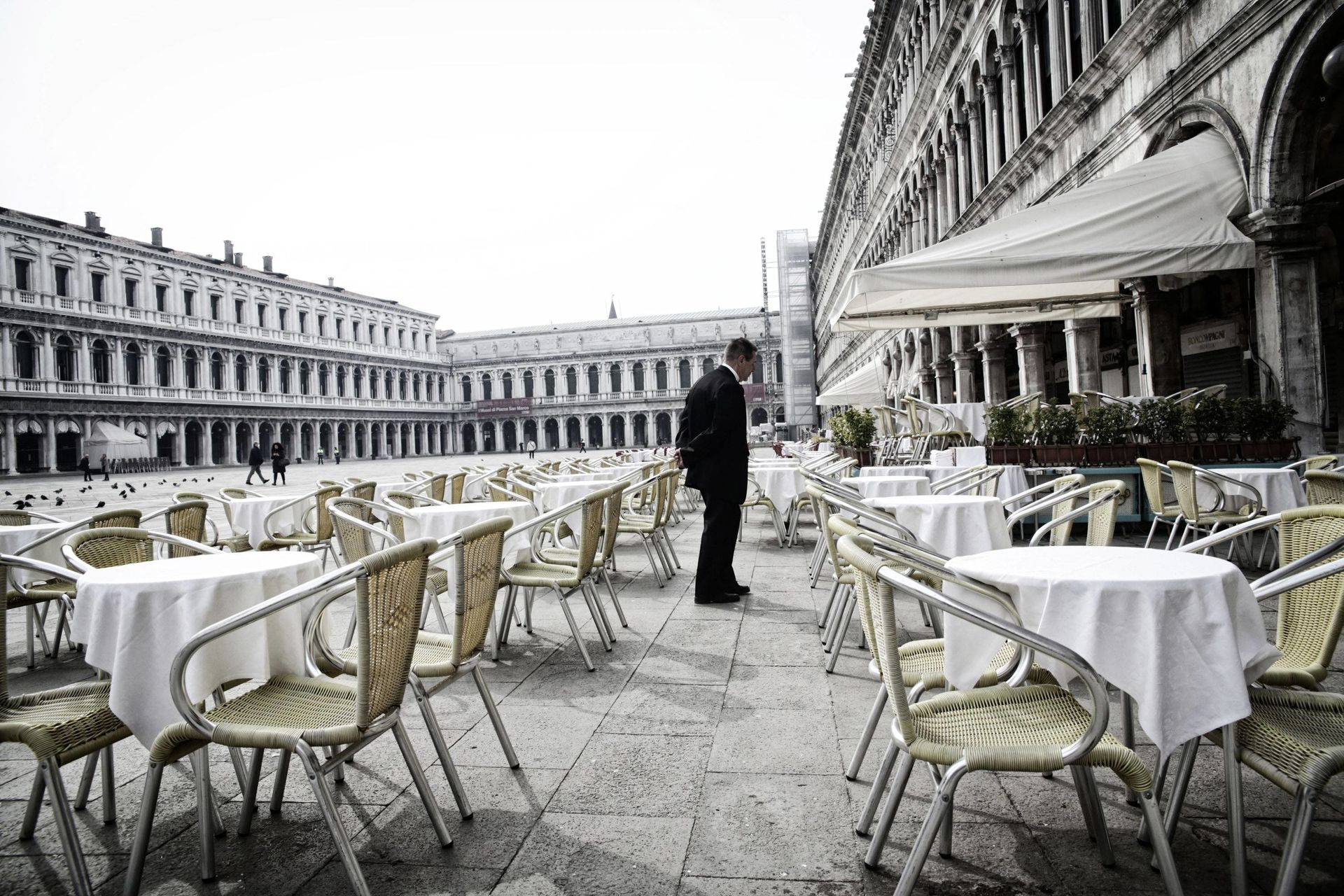 El aspecto desértico en la plaza de San Marcos en Venecia, normalmente a rebosar de turistas.