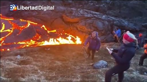 El volcán islandés que sigue expulsando lava atrae a miles de personas y algunas como los fotógrafos que se acercan todo lo que pueden hasta el punto de casi quemarse con la lava.