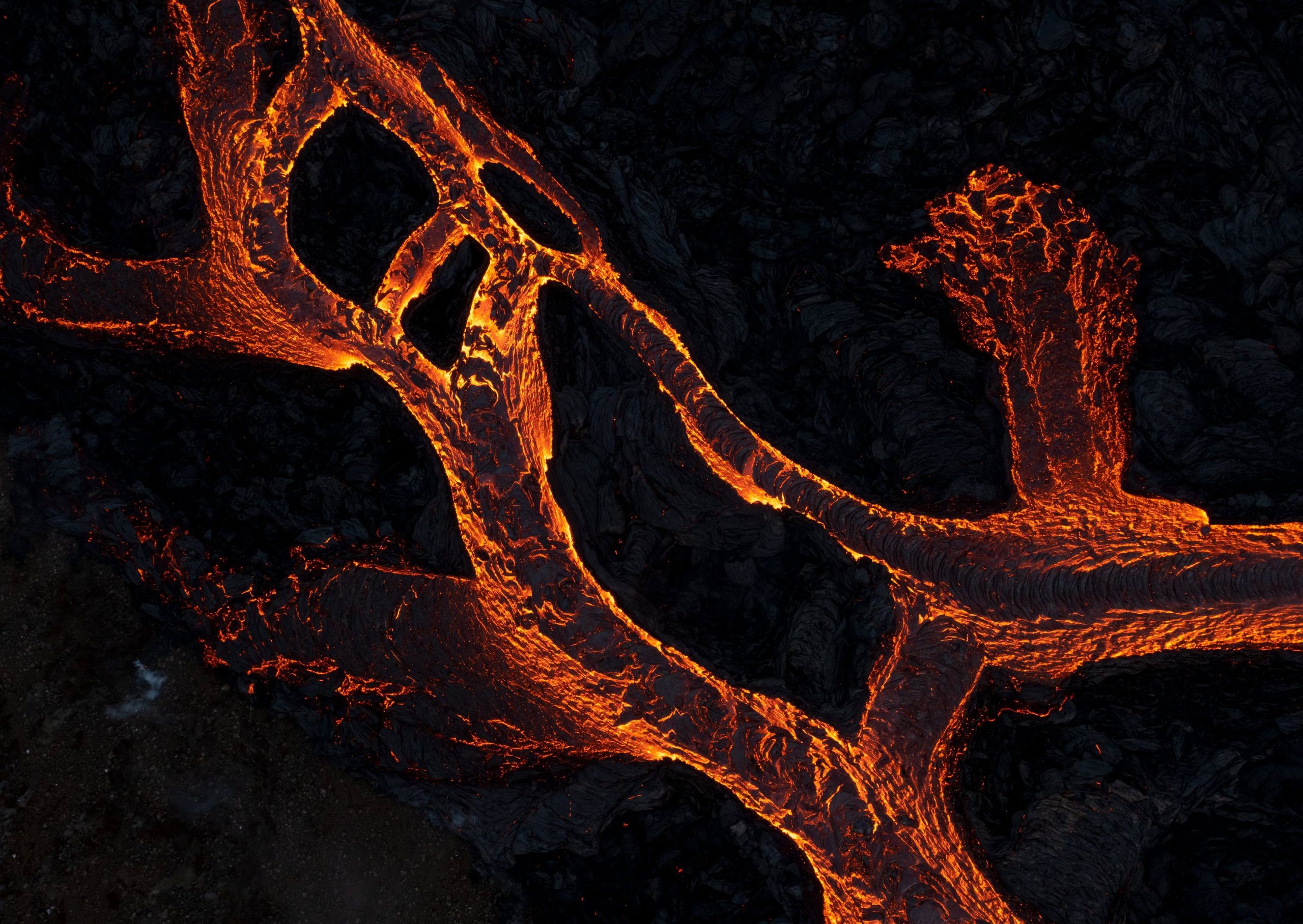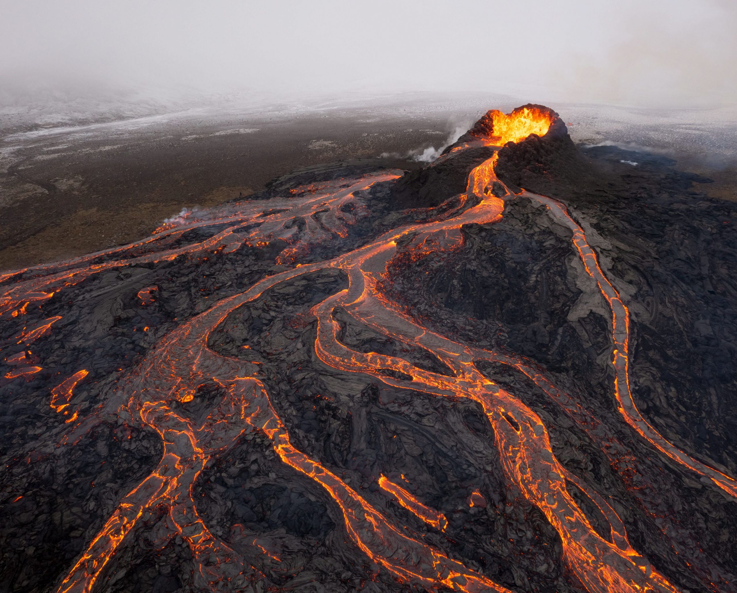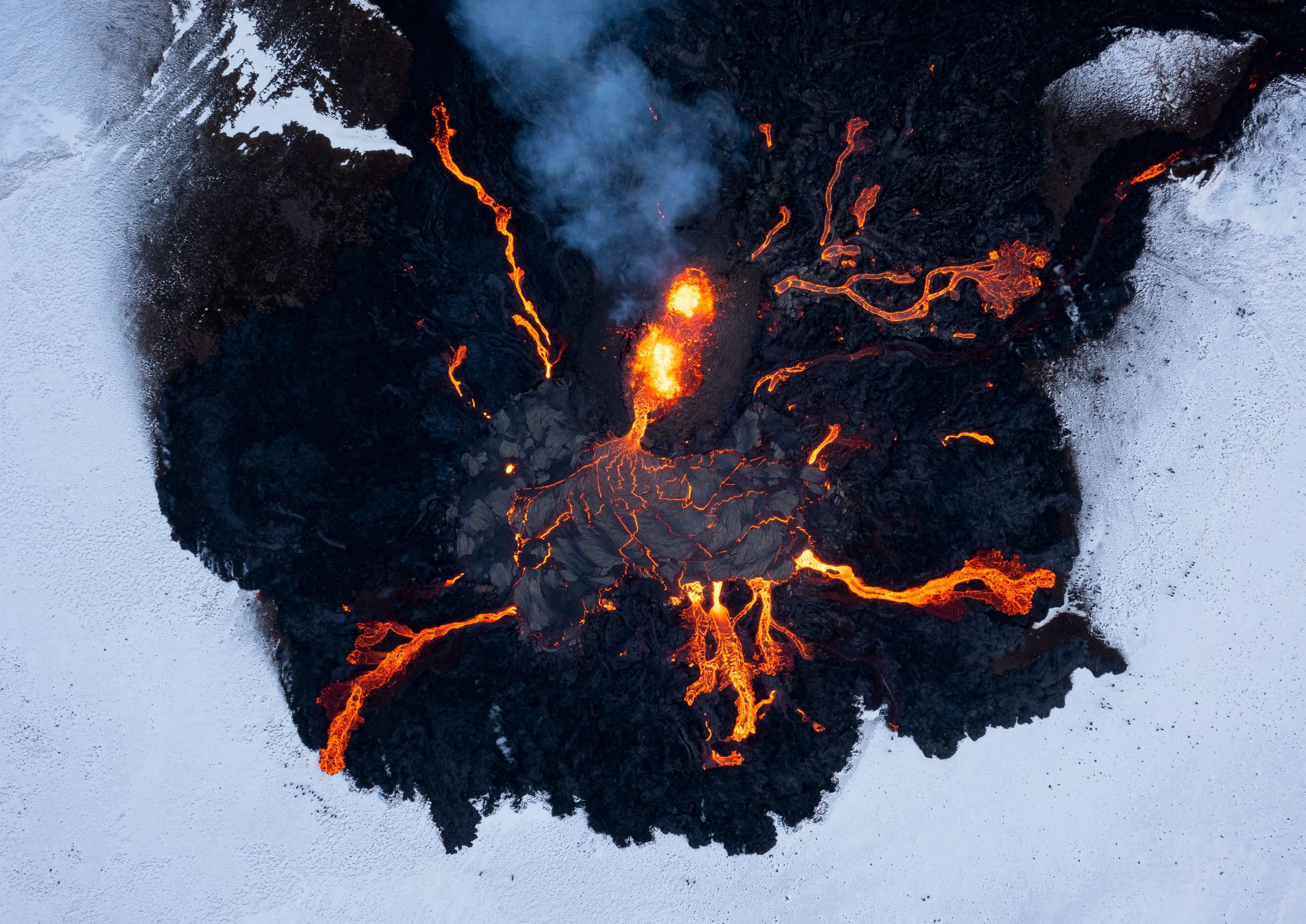 "Los ríos de lava fluían hacia abajo desde las fisuras, dividiéndose, reuniéndose, fluyendo alrededor de otras fisuras, llenando el valle de Geldingadalir y derramándose en los valles cercanos", según relata el fotógrafo.