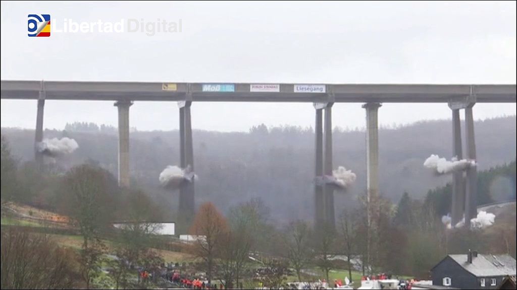 Desde Alemania llegan espectaculares imágenes de la detonación controlada de un viaducto de 70 metros de altura en el norte de Westfalia. Para su derribo han sido necesarios 120 kilos de explosivos.