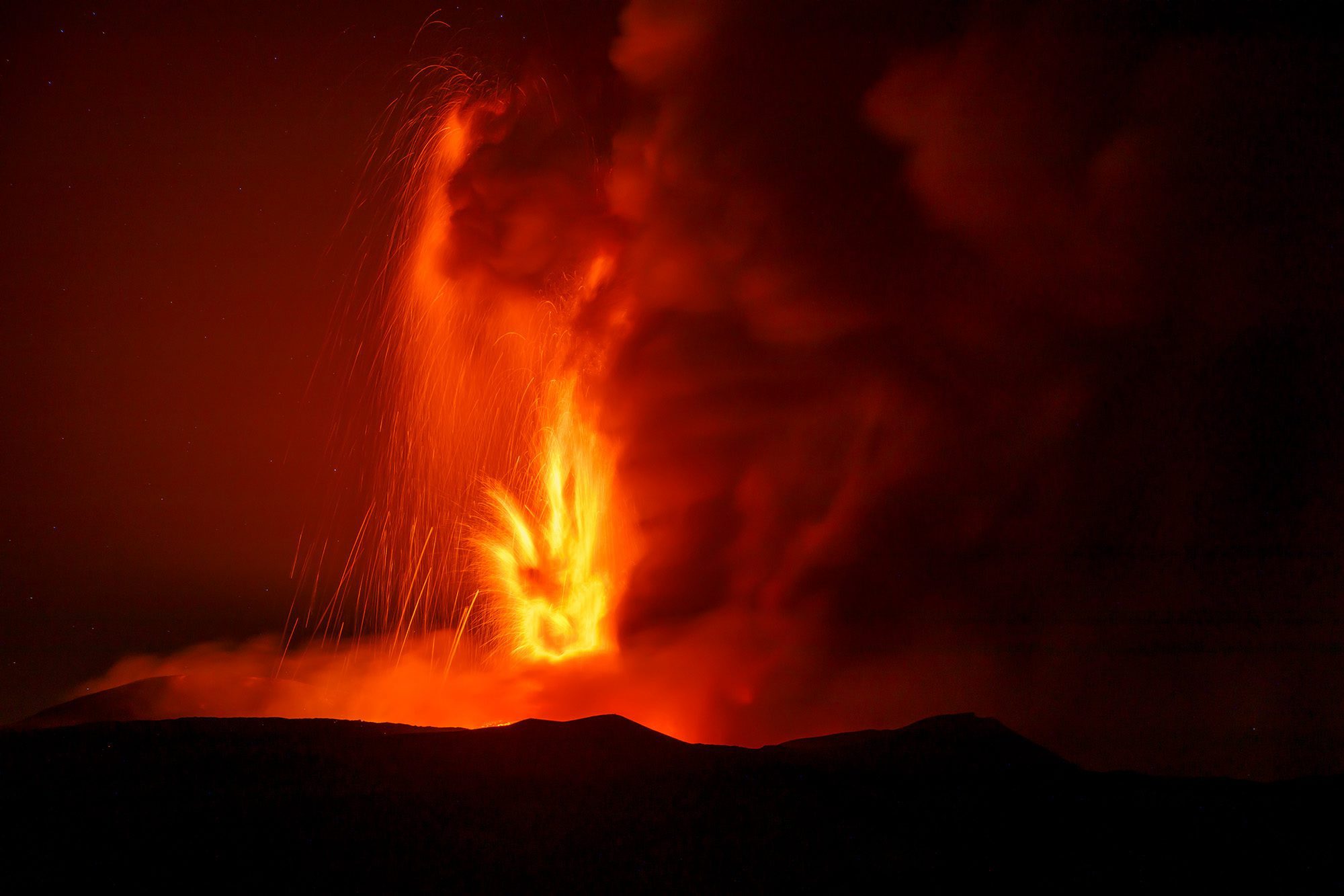 Son las columnas de humo de hasta 8 kilómetros de altura en el Etna, el volcán italiano que se encuentra en Sicilia. Humo que se eleva desde el cráter del Monte Etna tras una pequeña erupción. La lava roja fluyó del cráter a unos 2.900 metros sobre el nivel del mar. Los geólogos confirman que la actividad volcánica se detuvo por la noche. El cercano aeropuerto de Catania no se vio afectado por la ceniza.El monte Etna es el volcán más activo de Europa.