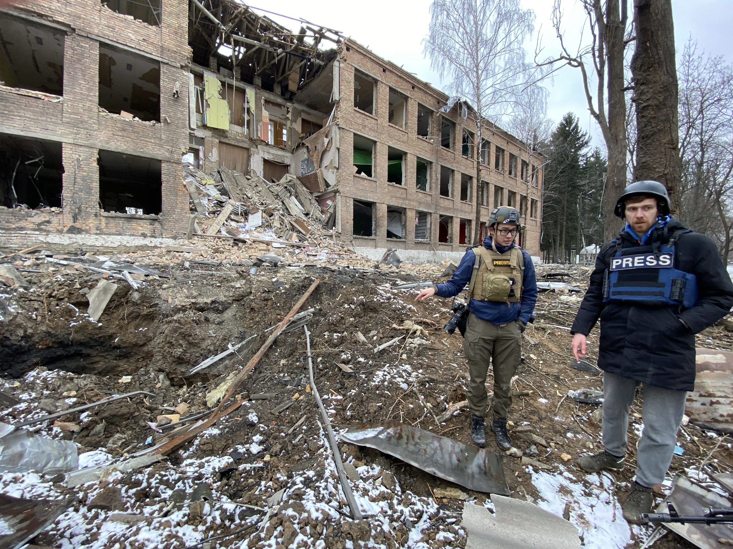 Dos periodistas visitan el lugar del ataque con cohetes lanzado por los invasores rusos que impactaron en el edificio del Colegio Profesional Vasylkiv ubicado en la calle Dekabrystiv 39, Vasylkiv, región de Kiev, al norte de Ucrania.