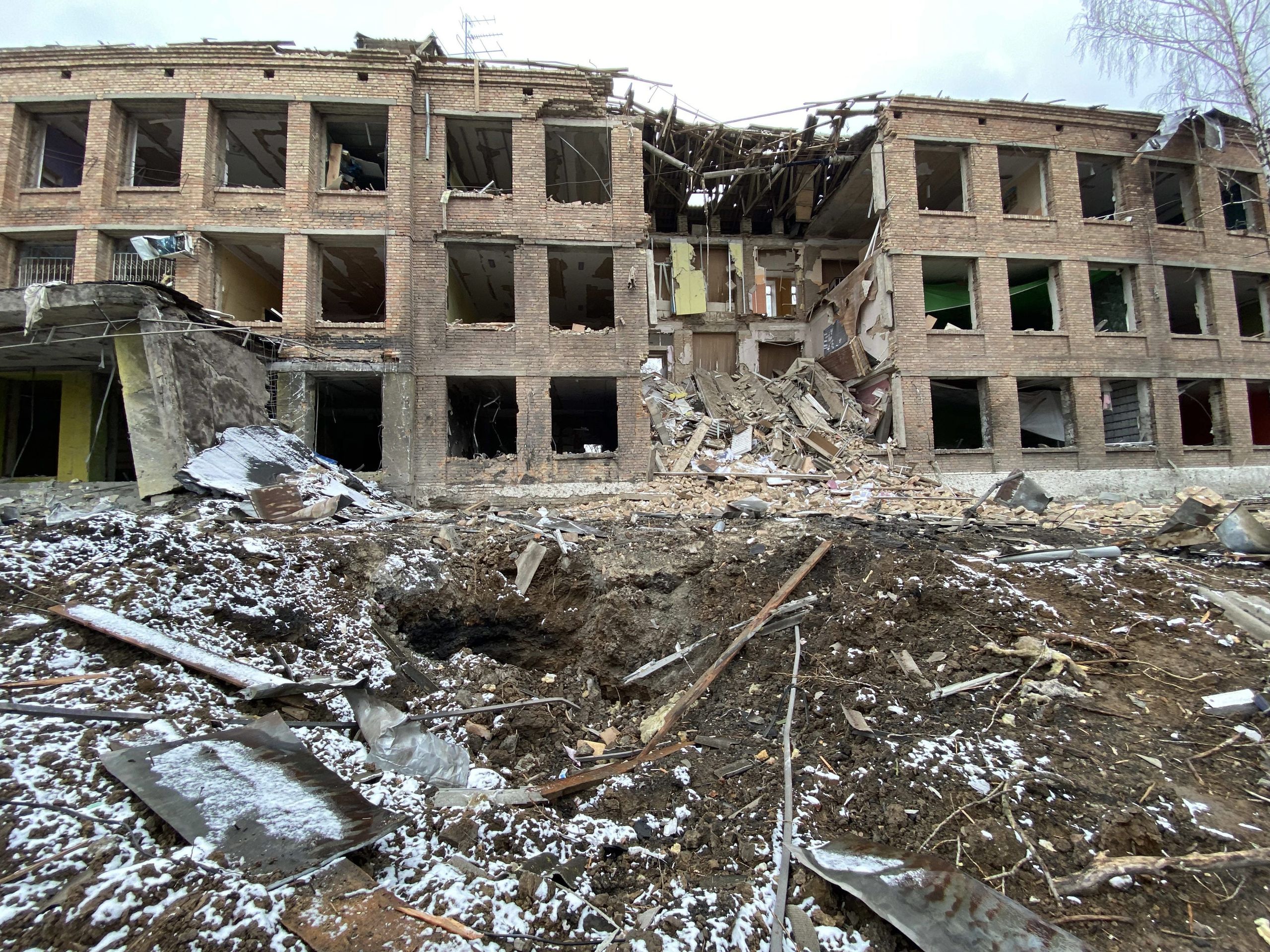 El edificio del Colegio Profesional Vasylkiv totalmente destruido ubicado en la calle Dekabrystiv 39, en la región de Kiev, al norte de Ucrania.