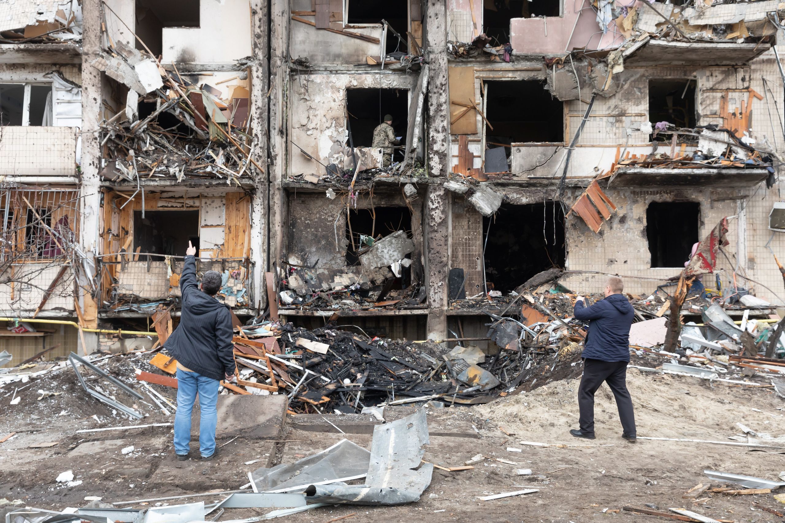 Kiev, Ucrania. Dos ciudadanos miran la escena después de que un edificio residencial fuera dañado tras un bombardeo ruso mientras las fuerzas rusas lanzan una invasión a gran escala de Ucrania.