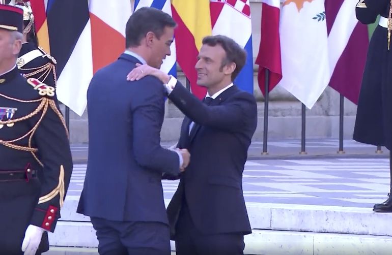 Macron se ha mostrado muy efusivo con el presidente español, Pedro Sánchez, a su llegada a la cita. Ambos han intercambiado apretones de manos, abrazos y palmadas en el hombro en un cálido recibimiento.